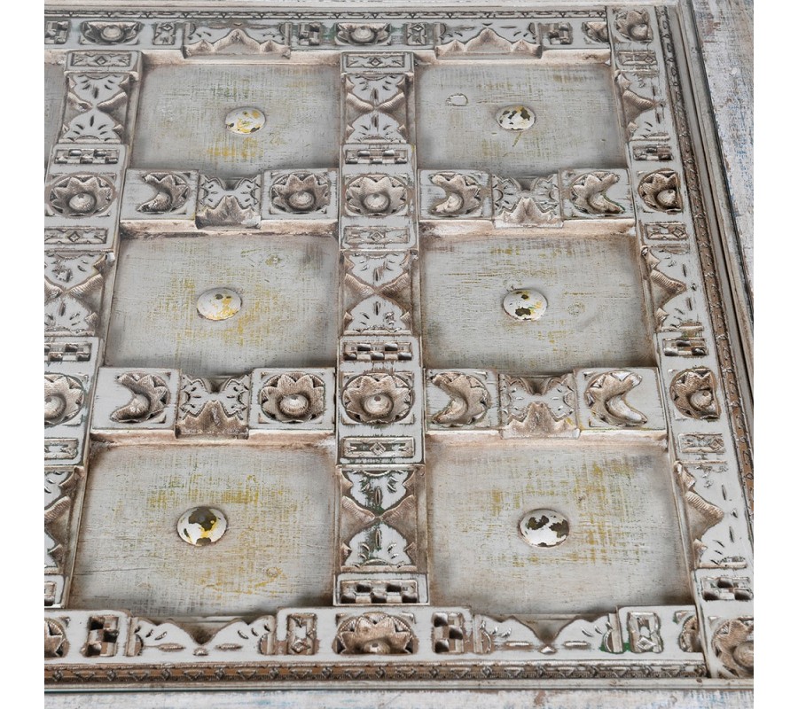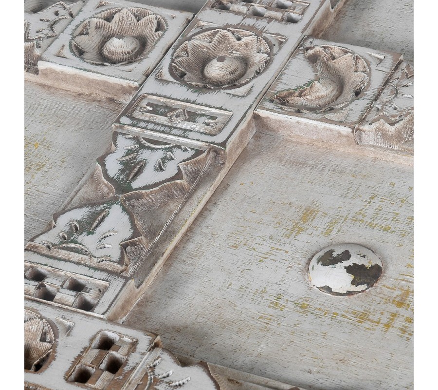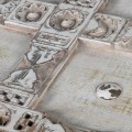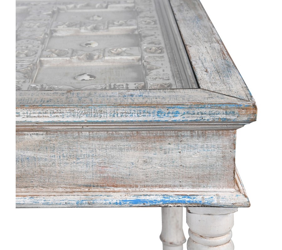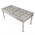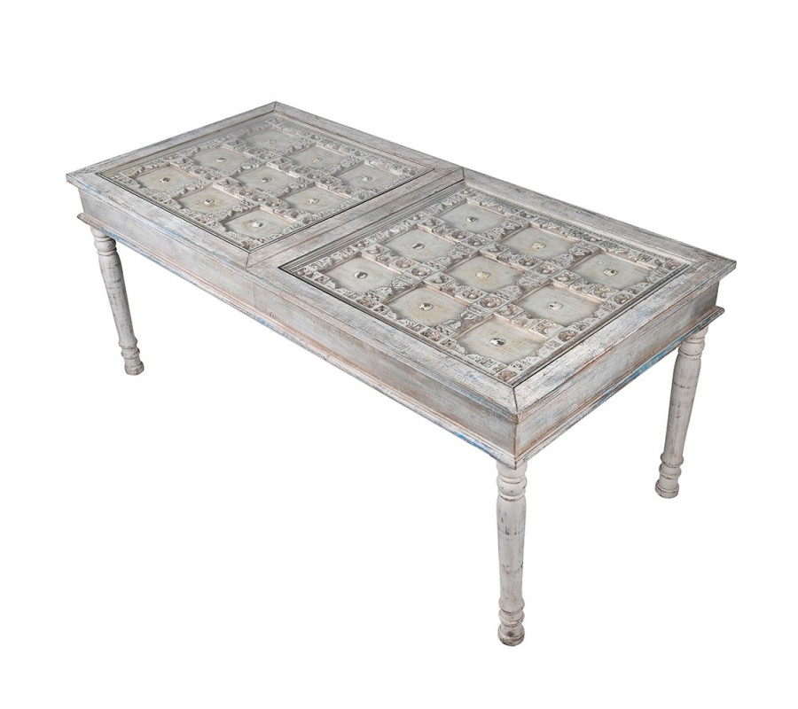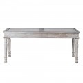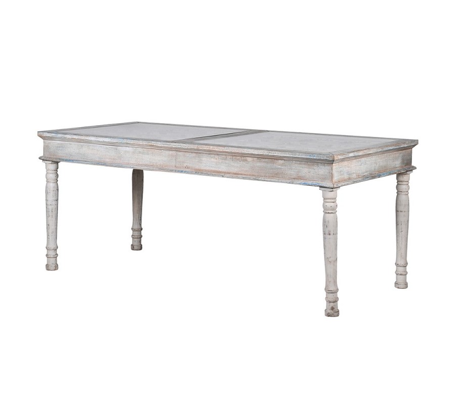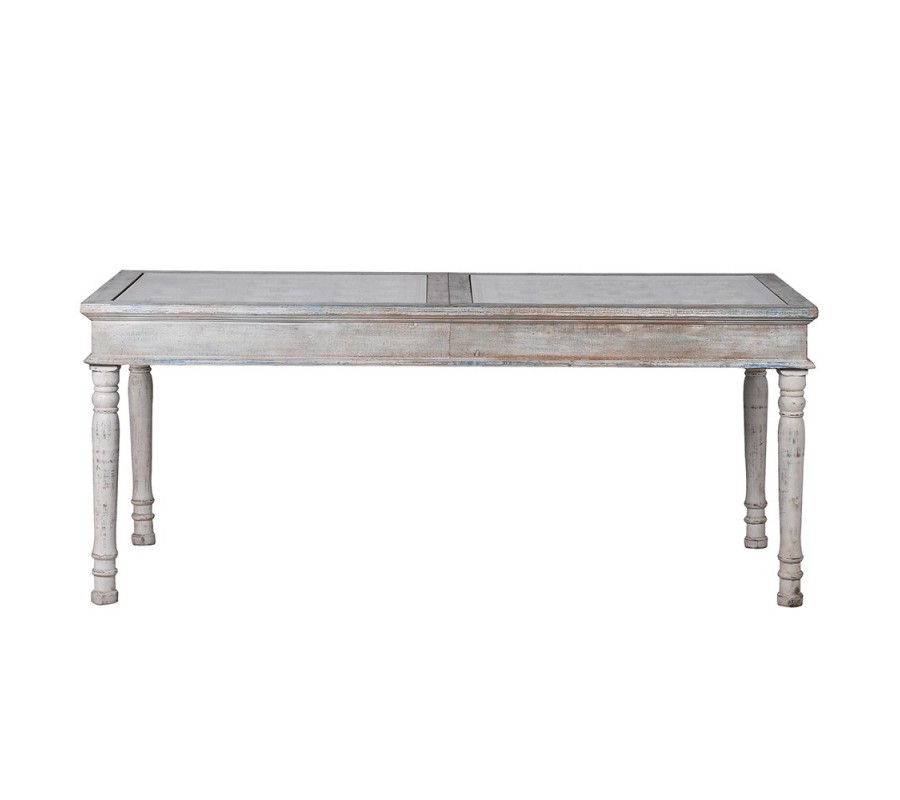 Luxusný jedálenský stôl Valensole sa stane štýlovým stredobodom vašej jedálne. Vrchná časť je zložená z dvoch tabúľ s kazetovým zdobením. Okraje kaziet sú vyvýšené a zdobené florálnymi motívmi. V centre každej z nich sa nachádza odhalená polguľovitá hlavička skrutky. Zaujímavé je aj povrchové opracovanie stola. Biely náter je efektne zošúchaný a ukazuje masívne drevo, z ktorého je stôl vyrobený a taktiež ďalšie farebné nátery. To dodáva stolu jedinečný šarm vintage nábytku. Štruktúrované kazetové časti sú prekrytý sklenenými doskami, takže stôl nie je len estetickým pôžitkom, ale aj plne funkčným nábytkom. Vrchná hranatá doska kontrastuje s elegantnými vyrezávanými nožičkami s oblými tvarmi. Stôl sa hodí do jedálne či kuchyne zariadenej v provensálskom štýle. Táto kombinácia si priam vyžaduje vázu s levanduľou, ktorá do vášho domova prinesie skutočnú atmosféru južného Francúzska. Dobrou voľbou sú aj vintage stoličky v podobných svetlých odtieňoch. Vďaka univerzálnej farbe však môžete priestor oživiť aj farebnými prvkami, ako napríklad čalúnením na stoličkách, či kobercom. Jedálenský stôl môžete doplniť ďalším nábytkom z kolekcie Valensole, napríklad komodou. Za stôl pohodlne usadíte až 10 hostí.