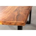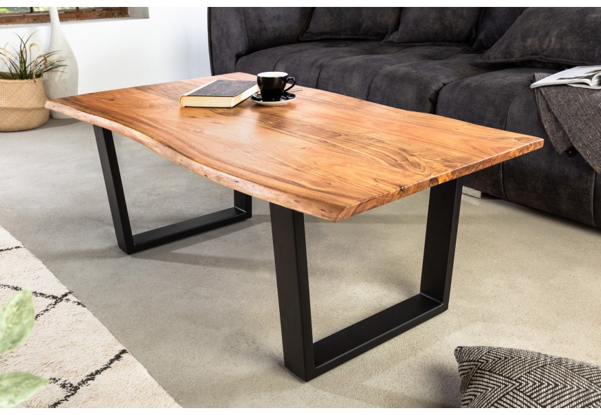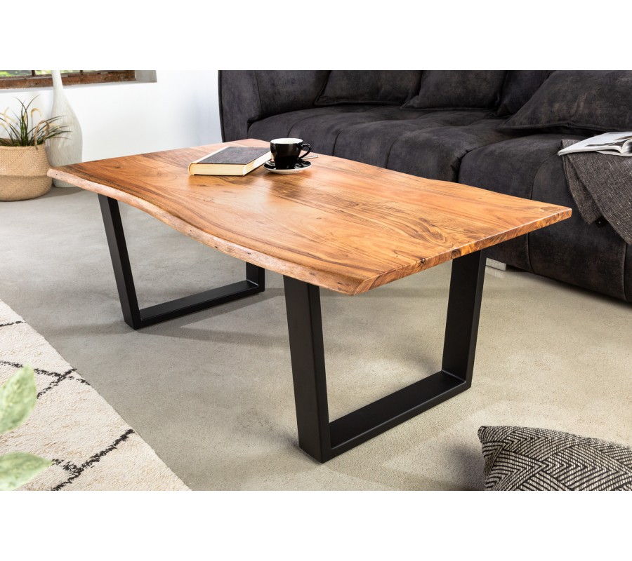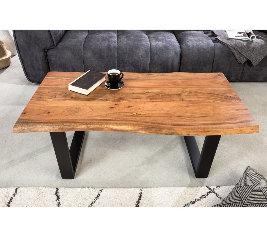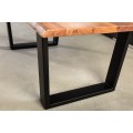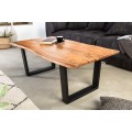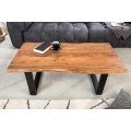 Moderný industriálny konferenčný stolík Mammut s vrchnou doskou z masívneho akáciového dreva v prírodnej hnedej farbe 120 cm