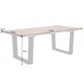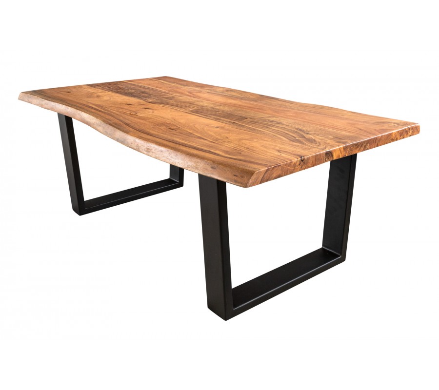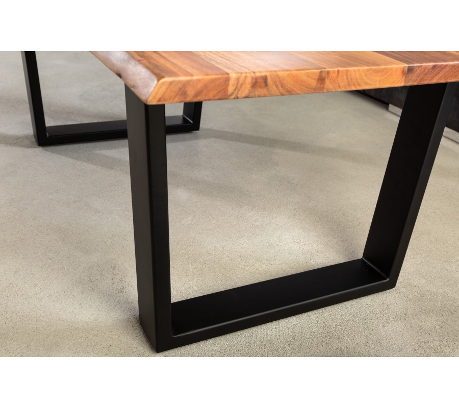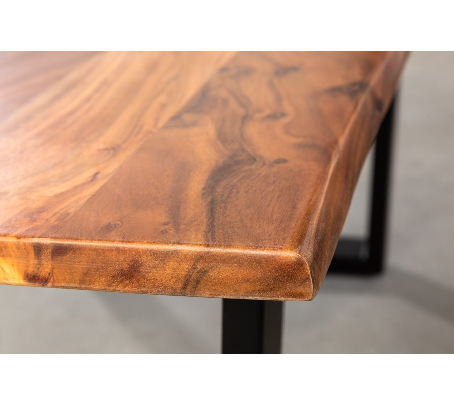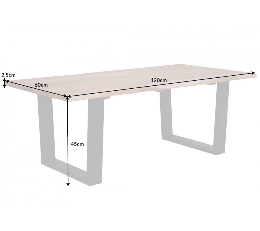 Na prvý pohľad vás očarí vrchná doska stola, ktorá je vyrobená z akáciového dreva. Tento materiál je mimoriadne tvrdý, vďaka čomu nábytok dlhodobo odoláva vplyvom každodenného používania a dlho vám vydrží. Tvar dlhších hrán stolíka sleduje prirodzenú štruktúru dreva a je jedinečný na každom kuse nábytku. Vrchná doska je jednoduchá, s hladkým povrchom, na ktorom naplno vyniká kresba letokruhov dreva a nádherná svetlá hnedá farba.