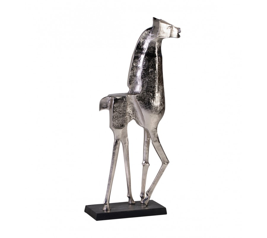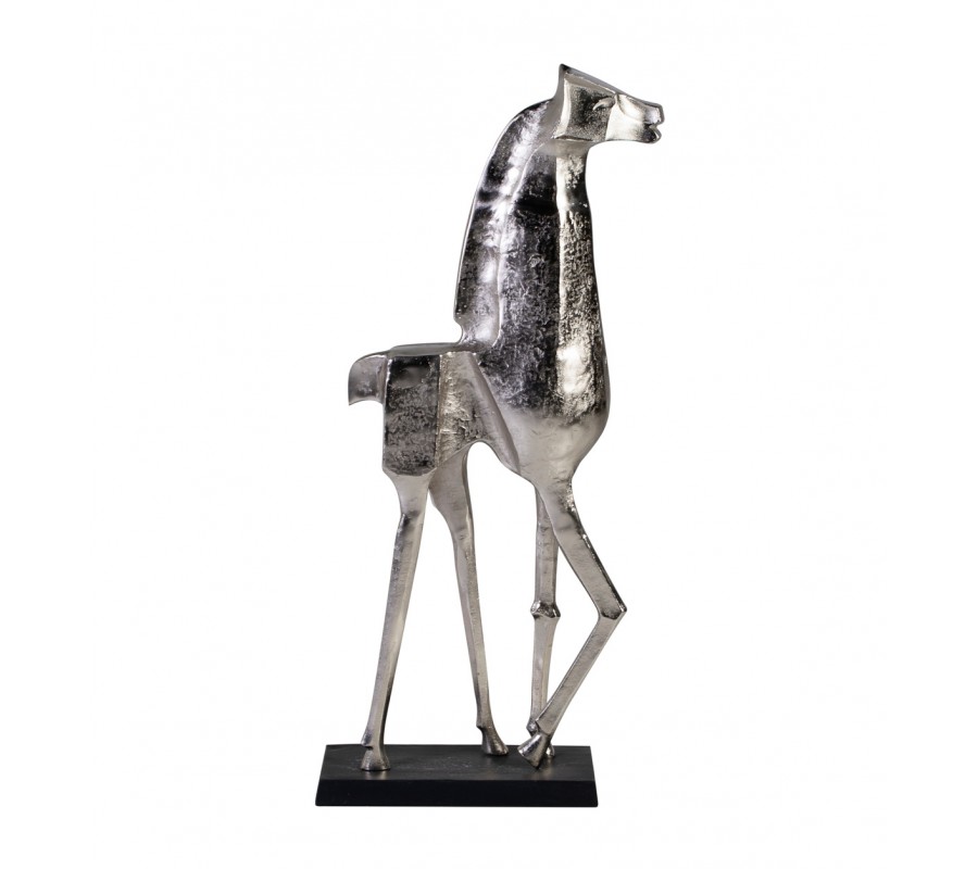 Socha zachytáva majestátnu figúru koňa v kroku. Prevedenie je inšpirované avantgardou. Zviera má disproporčný tvar, s veľkou hlavou a zmenšeným telom. V siluete si na prvý pohľad všimnete striktné rovné línie, ktoré dodávajú dekorácii charakter kubistickej skulptúry. S modernými tvarmi korešponduje aj extravagantná strieborná farba. Figúra je umiestnená na obdĺžnikovom podstavci v čiernej farbe. Je vyrobená z kovovej zliatiny.