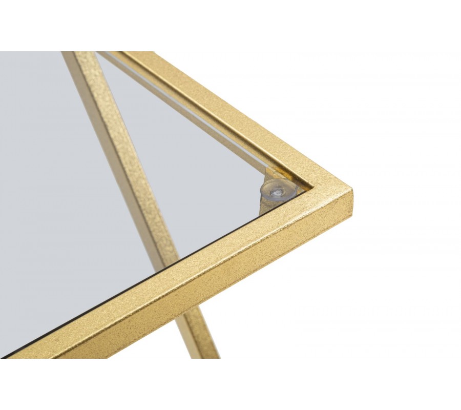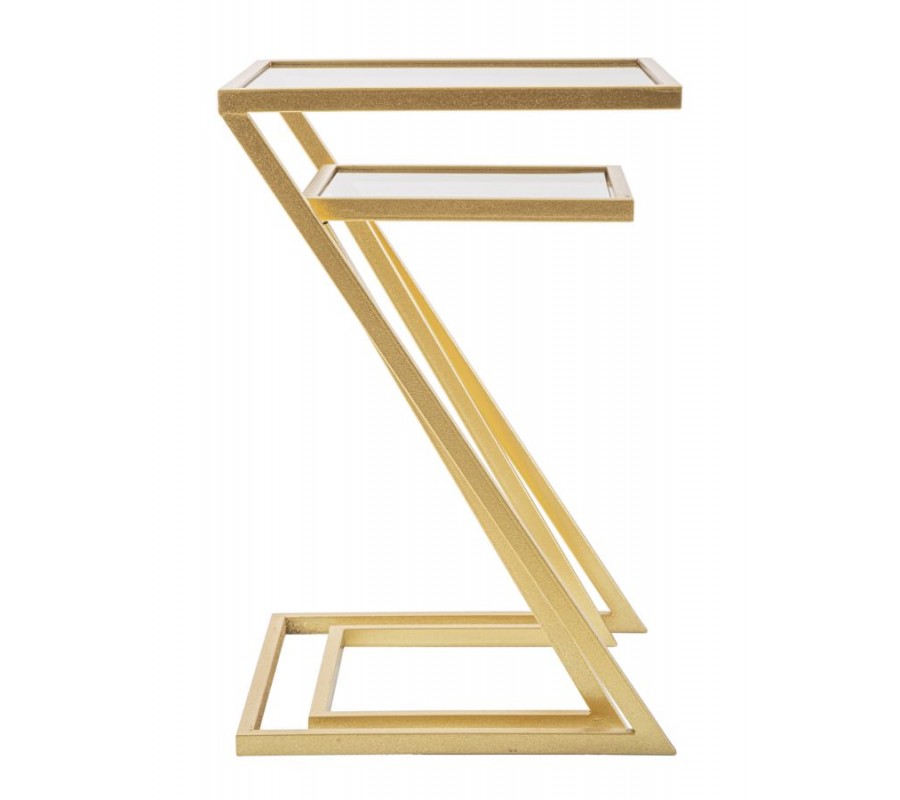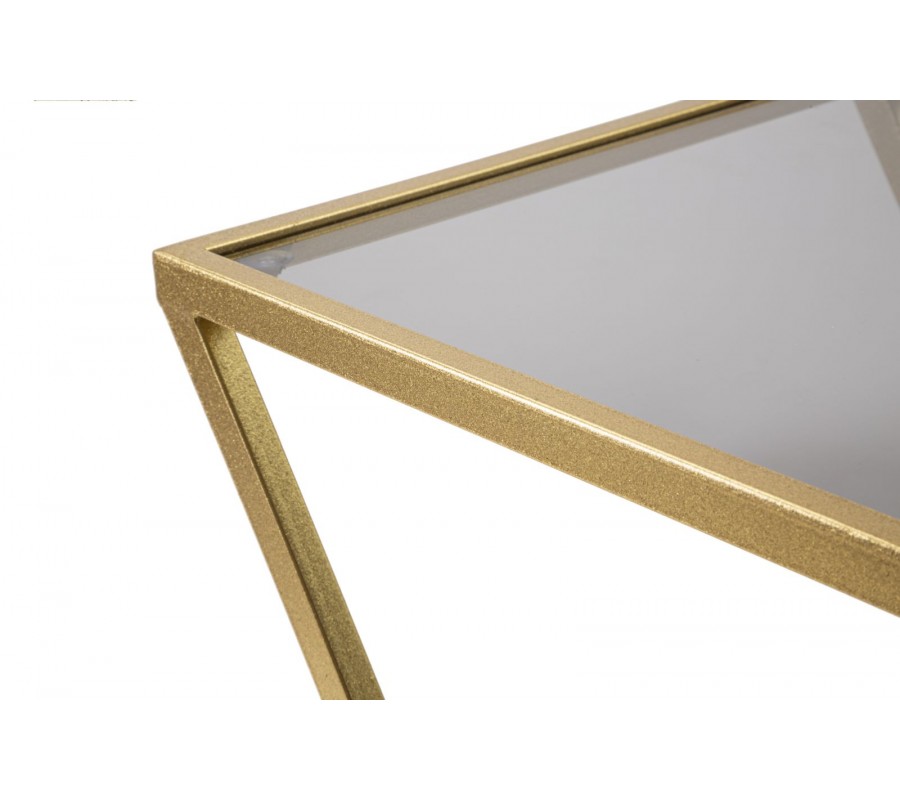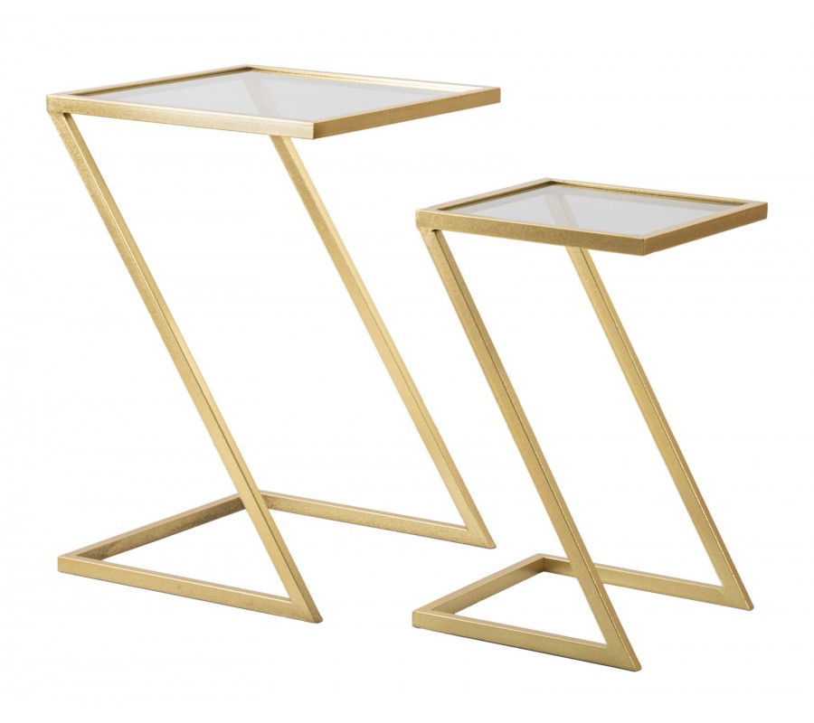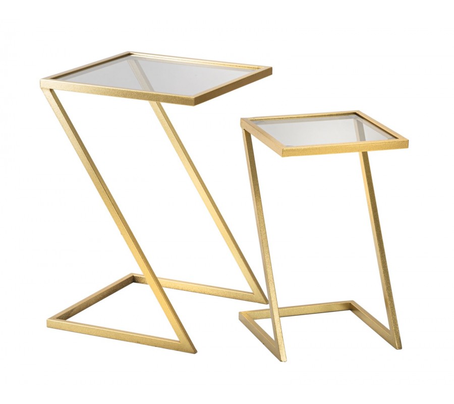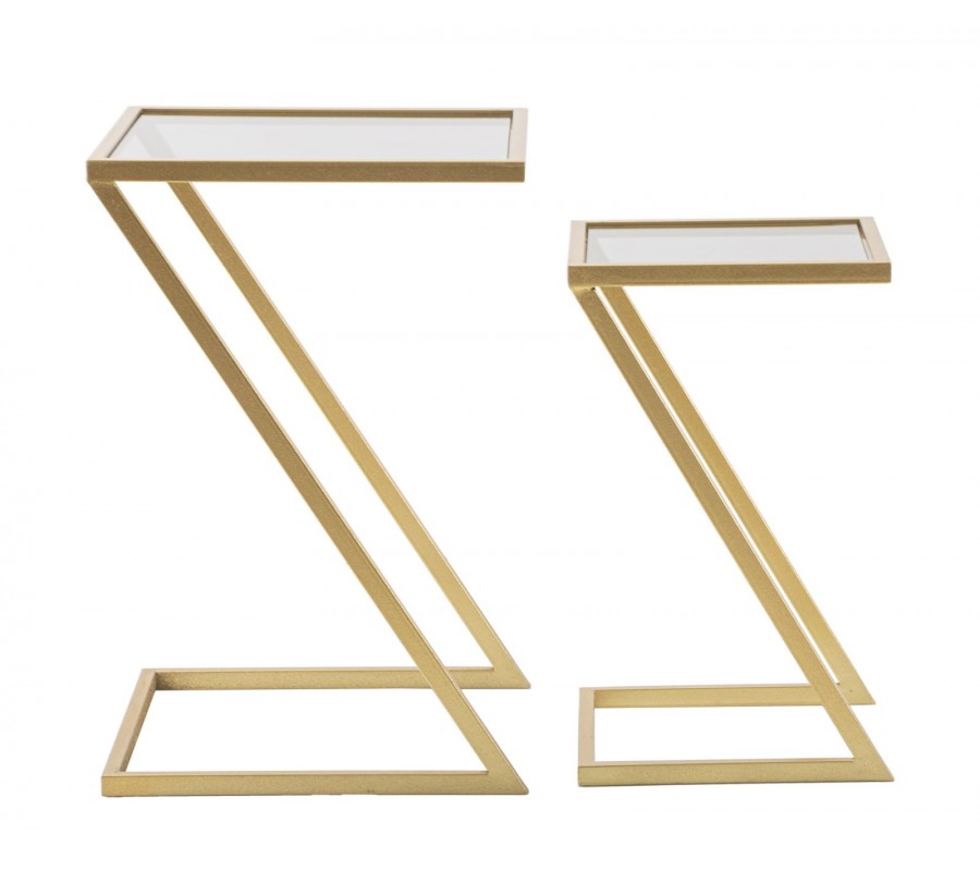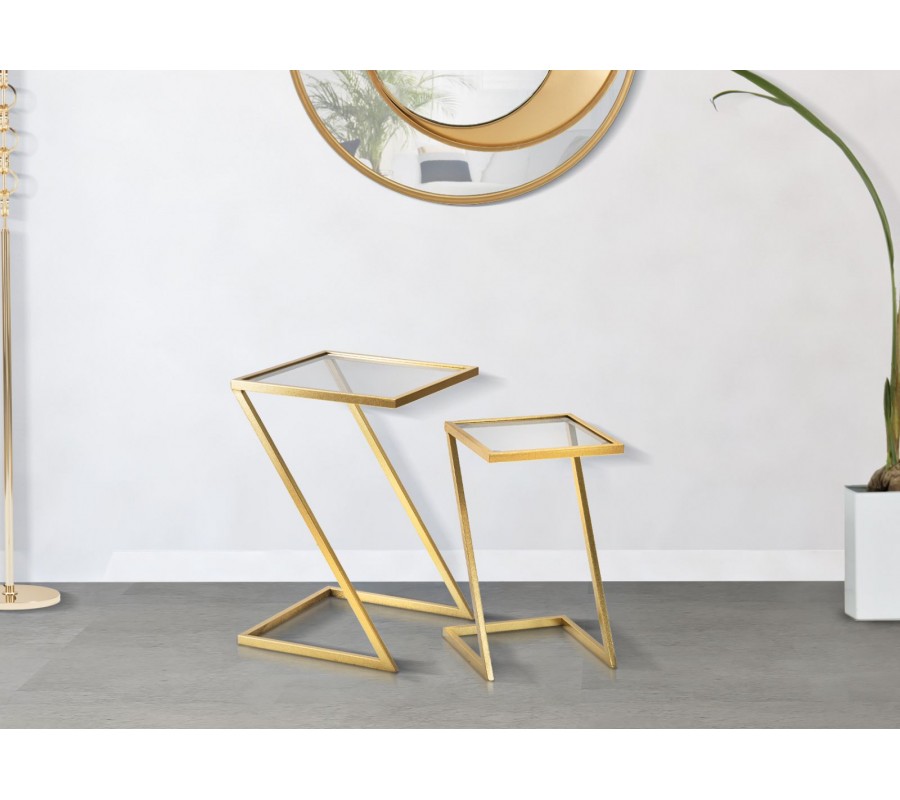 Sada dvoch príručných stolíkov Radan v art deco a glamour štýle zaujme svojím minimalistickým a geometricky čistým dizajnom v tavre Z. Stolíky majú štvorcovú vrchnú dosku zo skla, ktorá je mierne tmavá, čím dodáva elegantný kontrast k zlatému kovovému rámu.