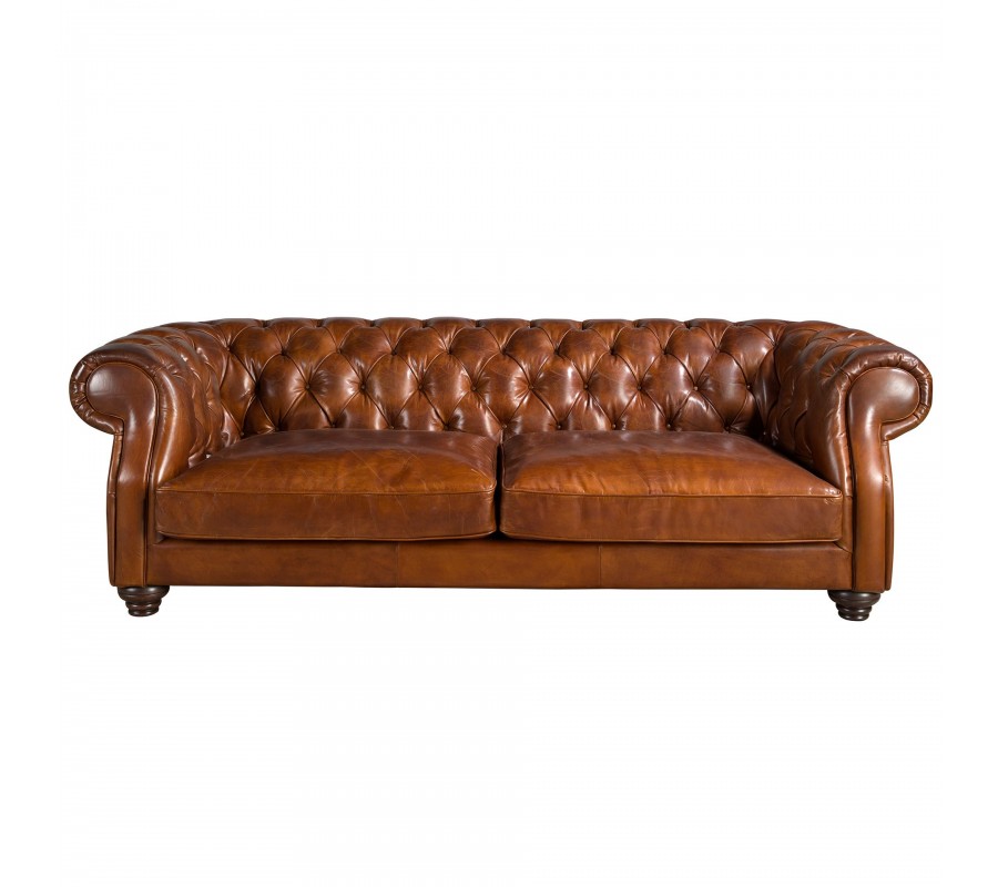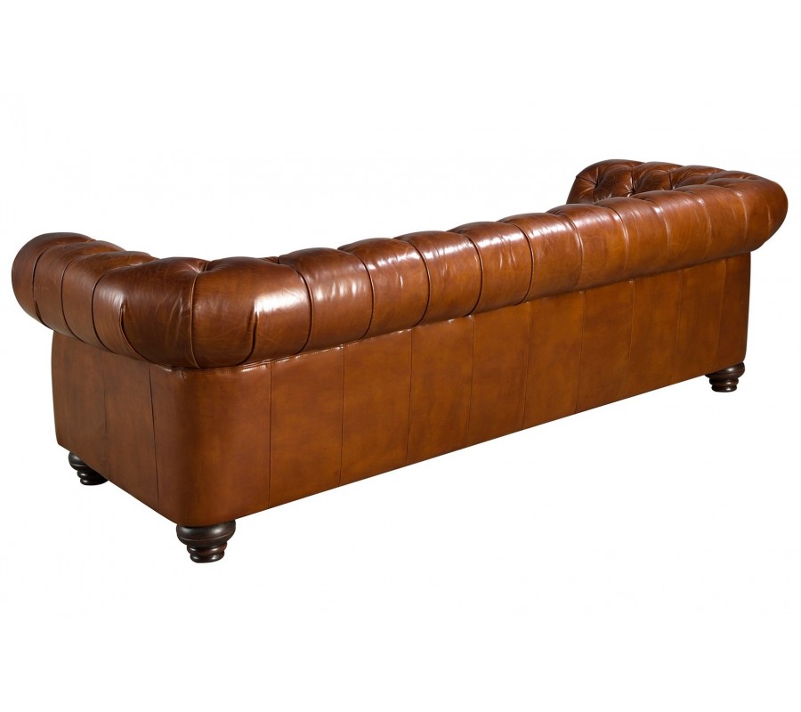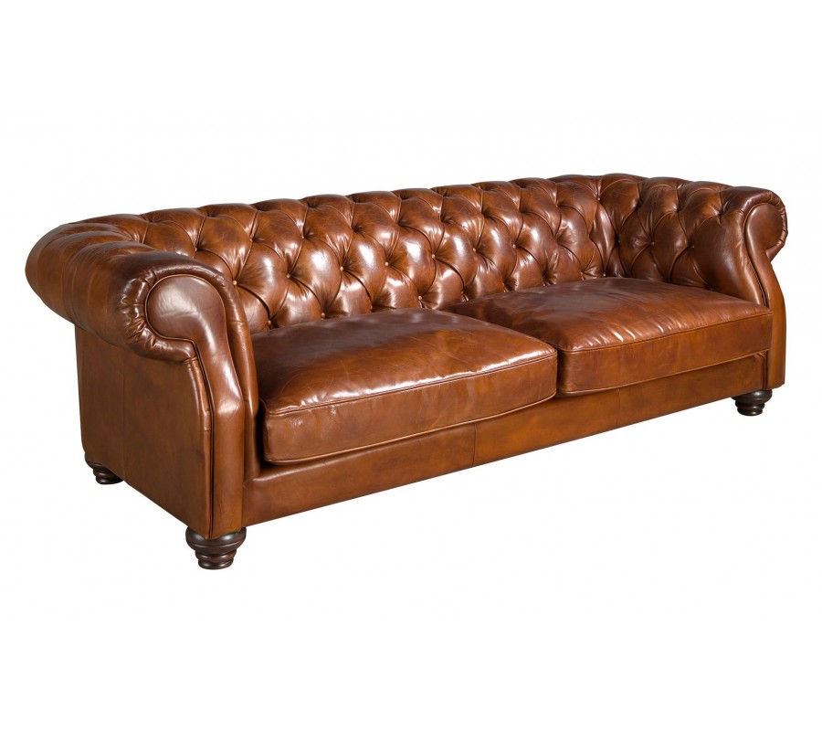 Luxusná chesterfield koňakovo hnedá trojmiestna sedačka Hastings s poťahom z pravej kože a vyrezávanými nožičkami 226 cm