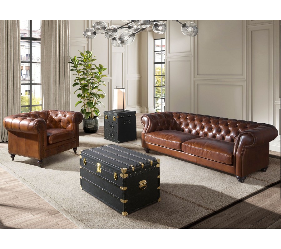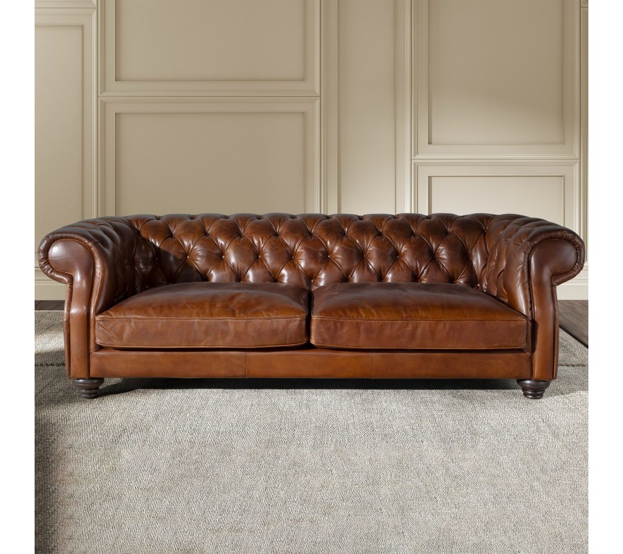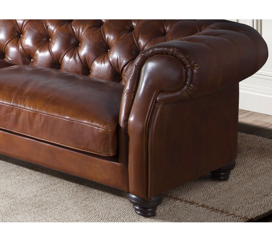 Sedačka má mohutnú siluetu s dvomi obdĺžnikovými sedacími vankúšmi, poskytujúcimi miesto pre tri osoby. Bočné opierky majú rovnakú výšku ako chrbtová opierka a zdobí ich prešívanie s okrúhlymi gombíkmi v chesterfield štýle, ktoré je synonymom luxusu. Klasický dizajn zdôrazňuje aj charakteristické rolovanie vrchnej časti opierok.