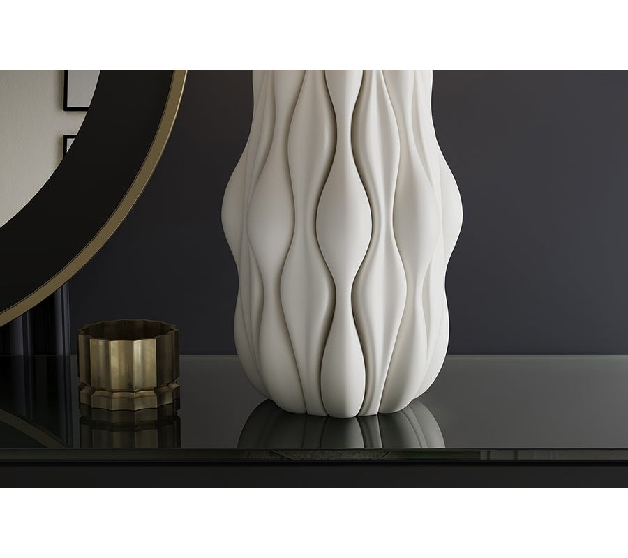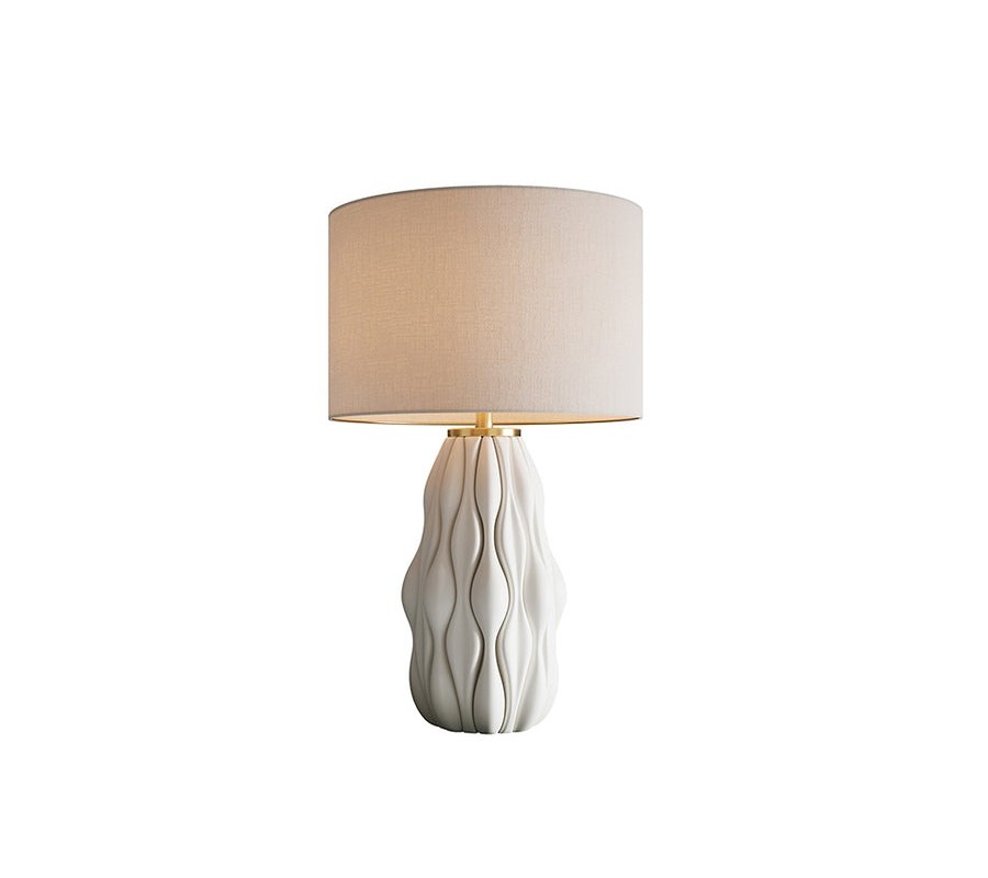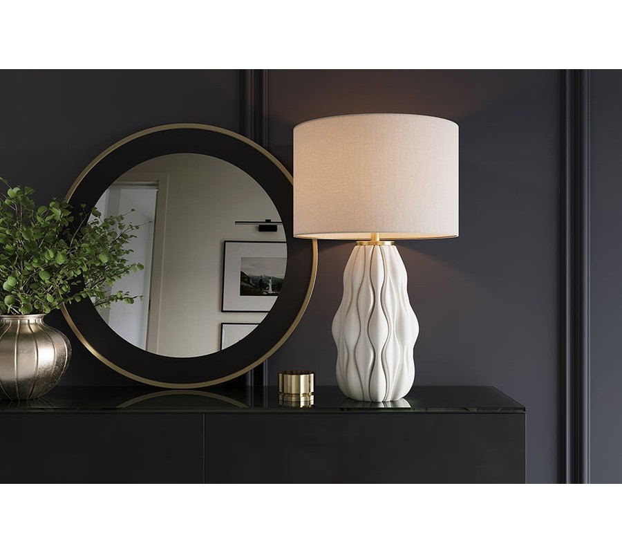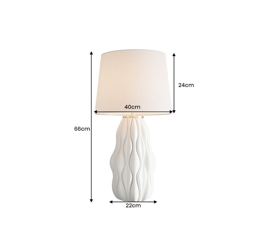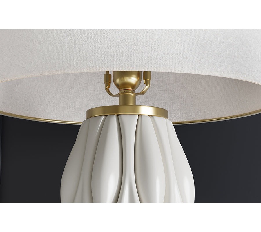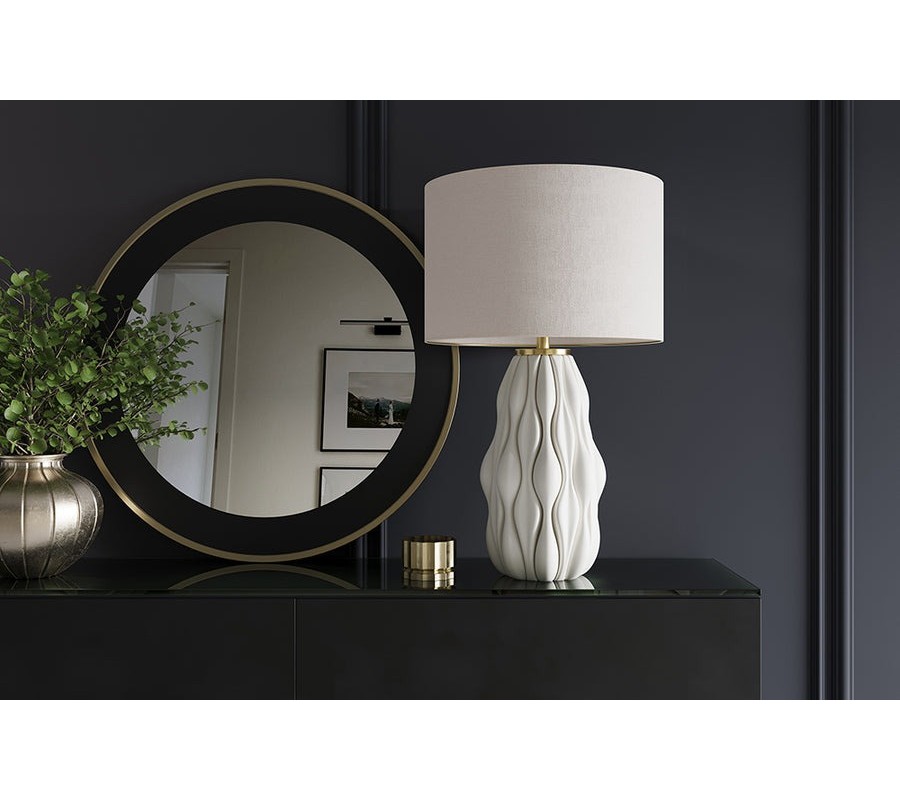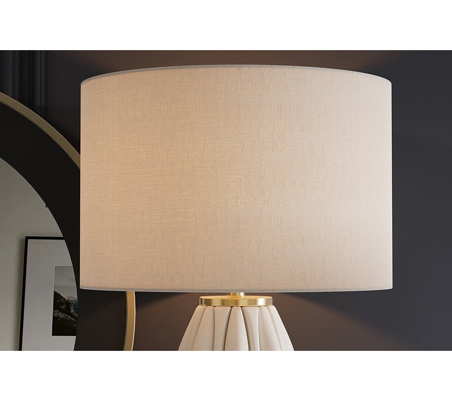 Lampa bude so svojou výškou 65 cm výrazným interiérovým doplnkom. Podstava je vyrobená z keramiky v bielej farbe a má moderný plastický vzhľad. Valcovitá noha sa smerom hore zužuje a zdobí ju výrazný reliéf so symetricky umiestnenými vertikálnymi vlnovkami. Zaoblené tvary pôsobia až organicky a pravidelnosť vzoru dodáva kompozícii eleganciu.