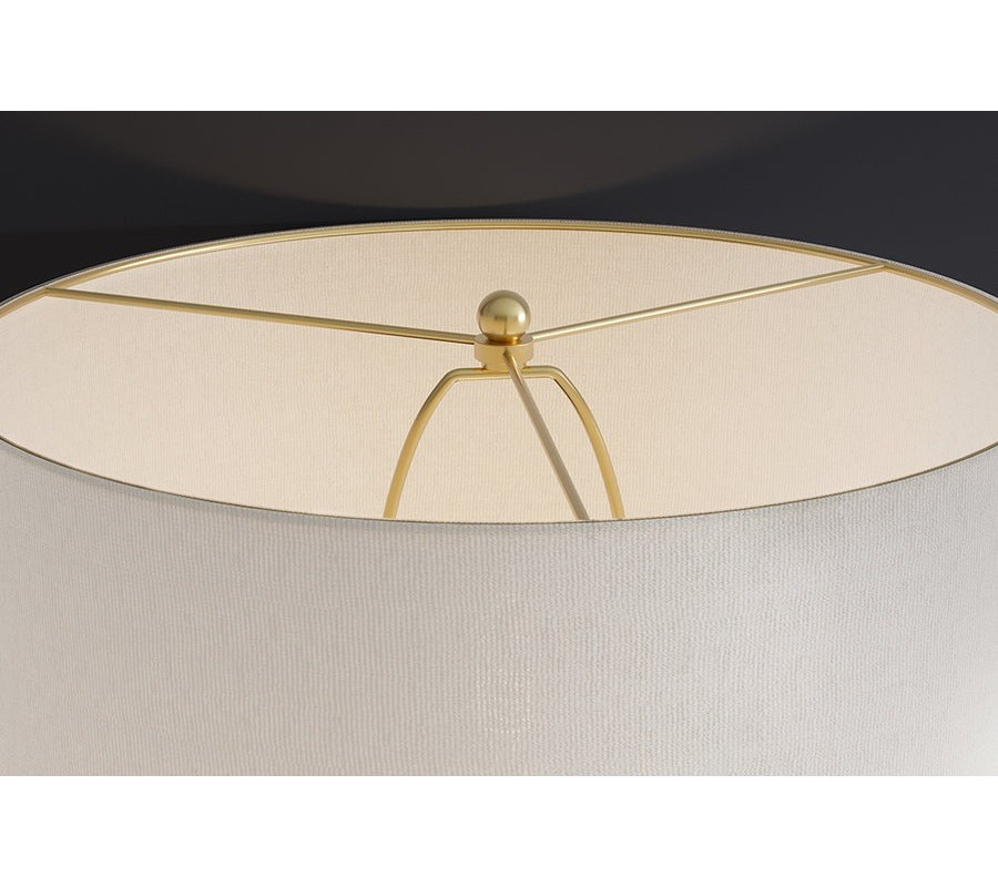 Tienidlo je taktiež biele a má jednoduchý valcovitý tvar, ktorý necháva naplno vyniknúť krásu podstavy. Je vyrobené z textilu s jemnou subtílnou štruktúrou, ktorý reguluje osvetlenie a pomôže vám vytvoriť v miestnosti útulnú atmosféru. Je potrebná žiarovka typu E27, ktorá nie je súčasťou balenia. Konštrukcia tienidla je vyrobená z kovu v zlatej farbe, ktorá dodáva do dizajnu luxusný akcent.