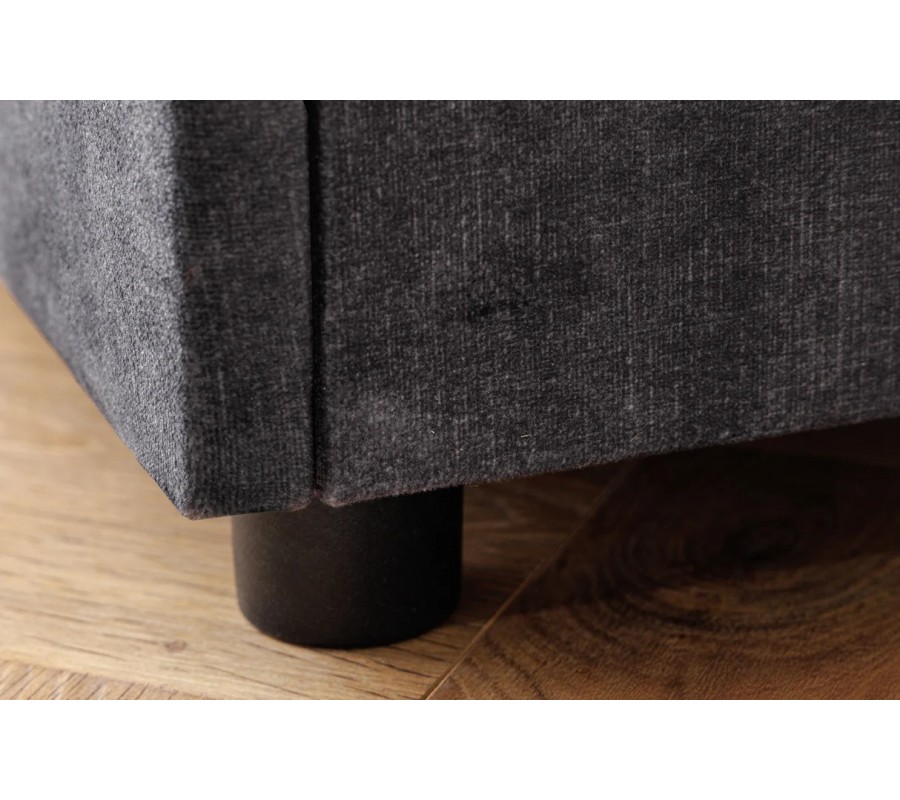 Stolík má lineárnu hranatú siluetu a pokrýva ho elegantný zamatový poťah. Mikrovlákno mu zaručuje výbornú odolnosť a sivá farba s jemným leskom pôsobí dojmom sofistikovaného luxusu. Výborne ho dopĺňajú akcenty v čiernej farbe v podobe nízkych valcovitých nožičiek a obdĺžnikových úchytiek na troch zásuvkách.