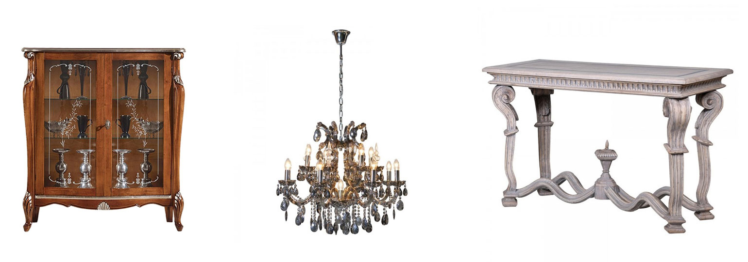 Baroková luxusná nízka masívna vitrína Pasiones na nožičkách s presklenými dvierkami 120cm | Exkluzívny zámocký luster Doveress s kovovou konštrukciou a zdobením z dymového skla 69cm | Rustikálna baroková konzola Imperia z masívu s bohatým ornamentálnym zdobením 132cm