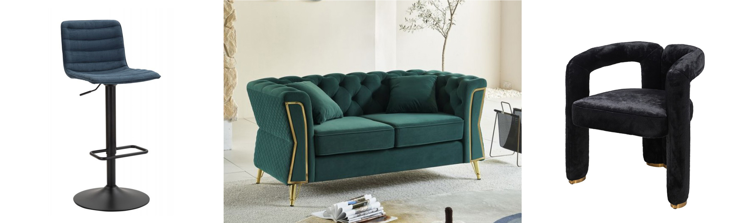 Moderná tmavomodrá barová stolička Lenza s menčestrovým poťahom | Glamour zelená zamatová sedačka Velaria | Luxusná čierna jedálenská stolička Teddy s kožušinovým poťahom