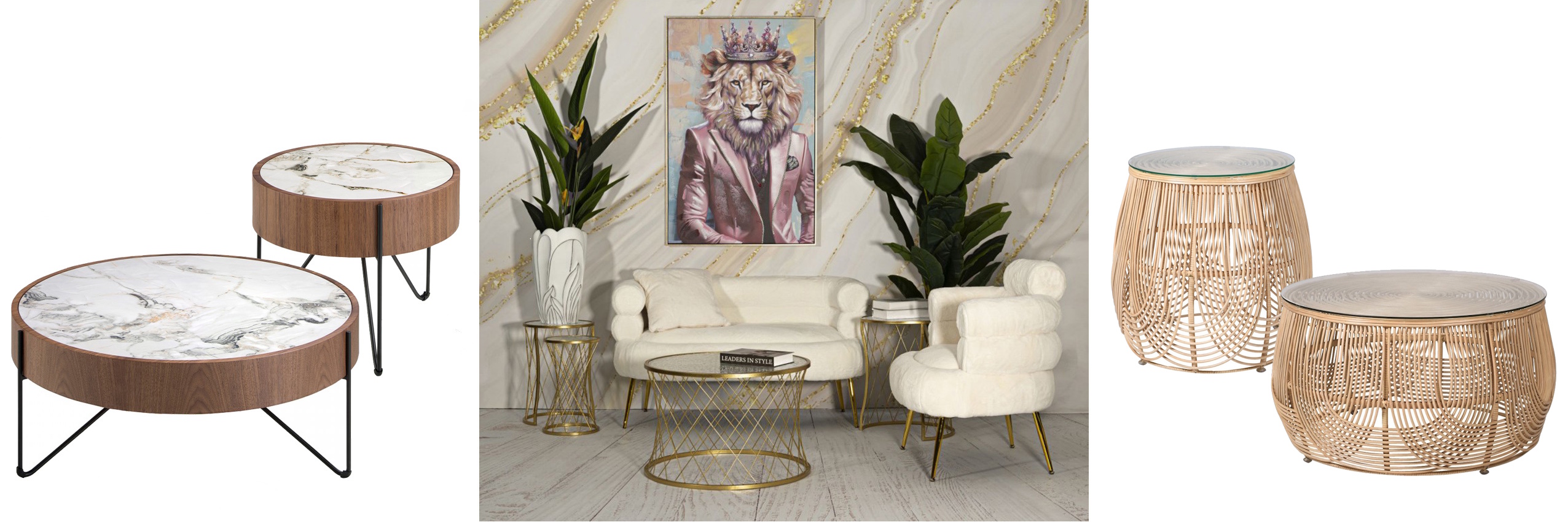 Luxusný mramorový konferenčný stolík Vita Naturale | Luxusný okrúhly príručný stolík Vita Naturale | Glamour sada konferenčného a príručných stolíkov Deli | Etno okrúhly príručný stolík Harmony | Ratanový okrúhly konferenčný stolík Harmony