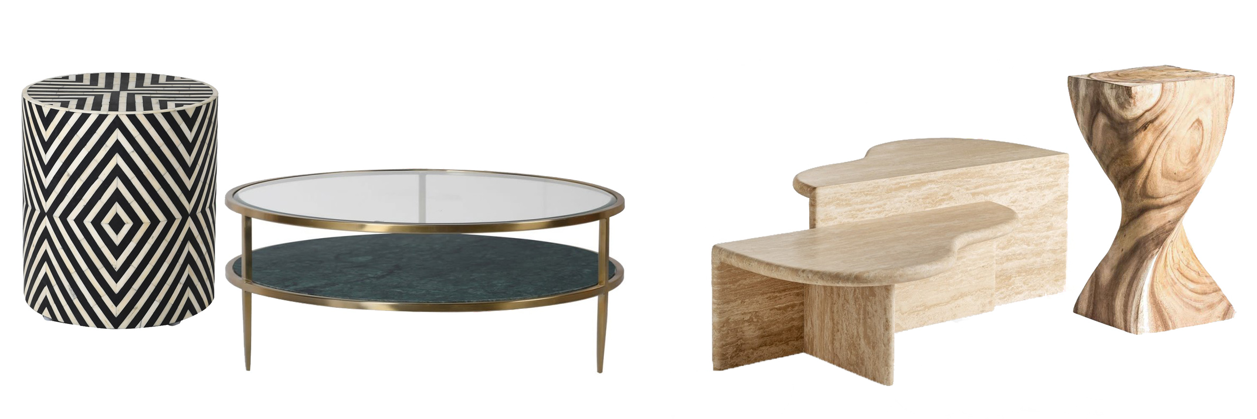 Art deco príručný stolík Daytona s čiernobielou intarziou | Okrúhly art deco konferenčný stolík Roanoke s mramorovou policou | Moderný konferenčný stolík Loris z travertínu | Moderný dizajnový masívny príručný stolík Cerebra