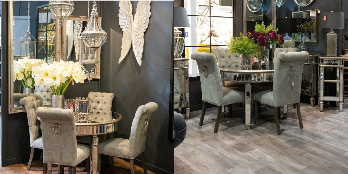 1. Luxusný zrkadlový okrúhly jedálenský stôl BELFRY | 2. Luxusný zkradlový príručný stolík Belfry