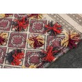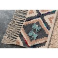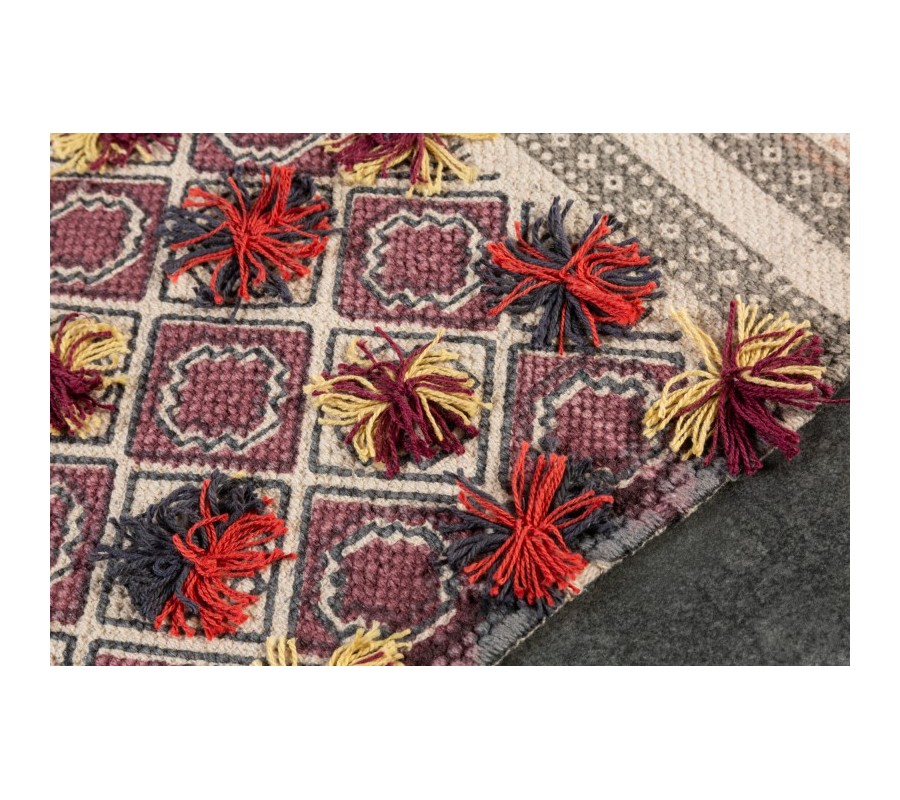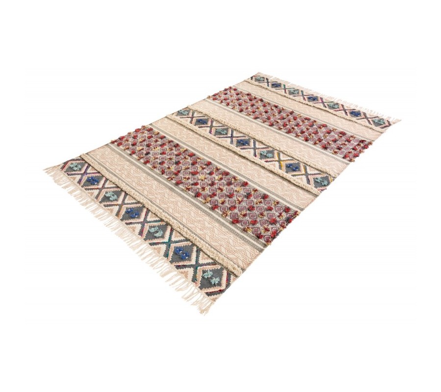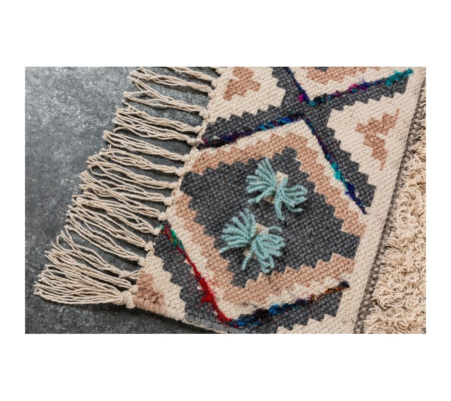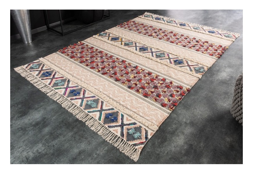 Oživte svoj interiér vďaka dizajnovému kobercu Suna v jedinečnom etno štýle. Etno štýlový koberec Suna sa pýši vyhotovením zo 100% bavlny, ktorému dominuje dekoratívne prevedenie viacfarebného vzoru. Vzor koberca pravidelne strieda dve línie, pričom prvá sa nesie v tvare X v modrej farbe, ktorá je obohatená o vystúpené strapčeky v tvare kvetu tmavo a svetlo modrej farby. Druhá línia zasa zachádza do opačného spektra farby, ktoré kombinuje červenú so žltou, čiernou a bordovou farbou, pričom vzor taktiež vytvára tvar kvietku. Dizajn koberca je v neposlednom rade obohatený o strapce po bočných stranách v béžovej farbe. Dizajnový etno koberec Suna perfektne vynikne v moderných interiéroch s etno drevenými dekoráciami, so sivými taburetmi, či sedačkami a taktiež s čiernym kovovým nábytkom z našich kolekcií Industria Negra a Industria Durante.