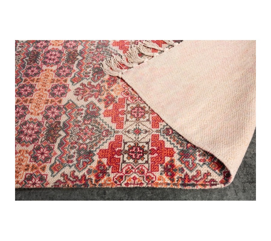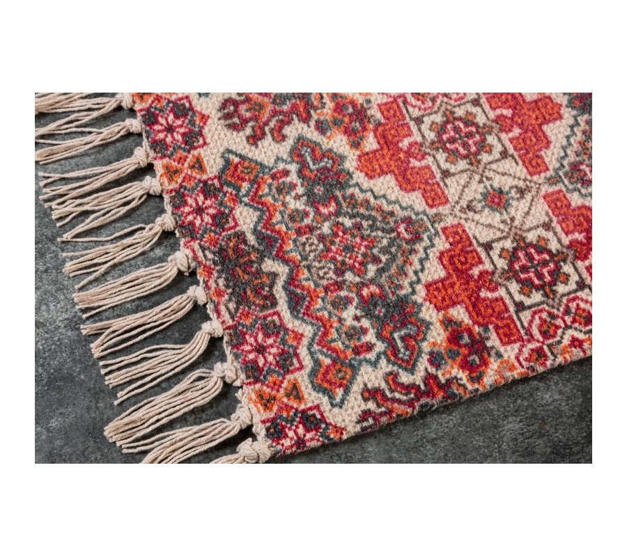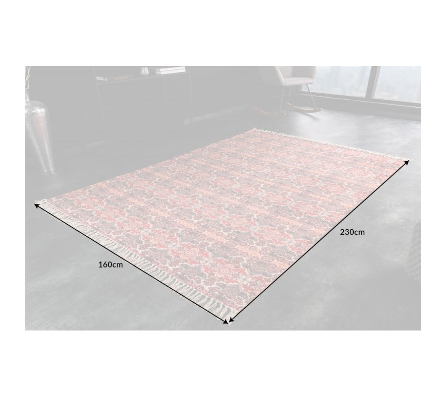 Koberec Besatty v orientálnom štýle zaujme vďaka svojim krásnym prenikavým odtieňom červenej farby použitej na vzorovanom tkaní. Koberec je vyrobený zo 100% bavlny a na oboch koncoch je obdĺžnikové prevedenie doplnené strapcami v krémovej farbe. Výborne sa bude hodiť do etno a orientálne ladených interiérov či už do obývačky, jedálne alebo vstupnej haly. Vlas koberca dosaduje 0,5cm, koberec Besatty je vhodný aj pri vykurovaní podlahovým kúrením, takže je určený aj do moderným domov či bytov. Červená farba vyniká na vzorovanej ploche vytvárajúcej dojem mysteriózneho blízkeho východu a zároveň pôsobí povzbudzujúco a oživí každú jednu miestnosť, do ktorej orientálny koberec Besatty zakomponujete. Vynikne v kombinácii s koloniálnym či rustikálnym nábytkom z masívneho dreva v škoricovej či čokoládovo hnedej farbe.