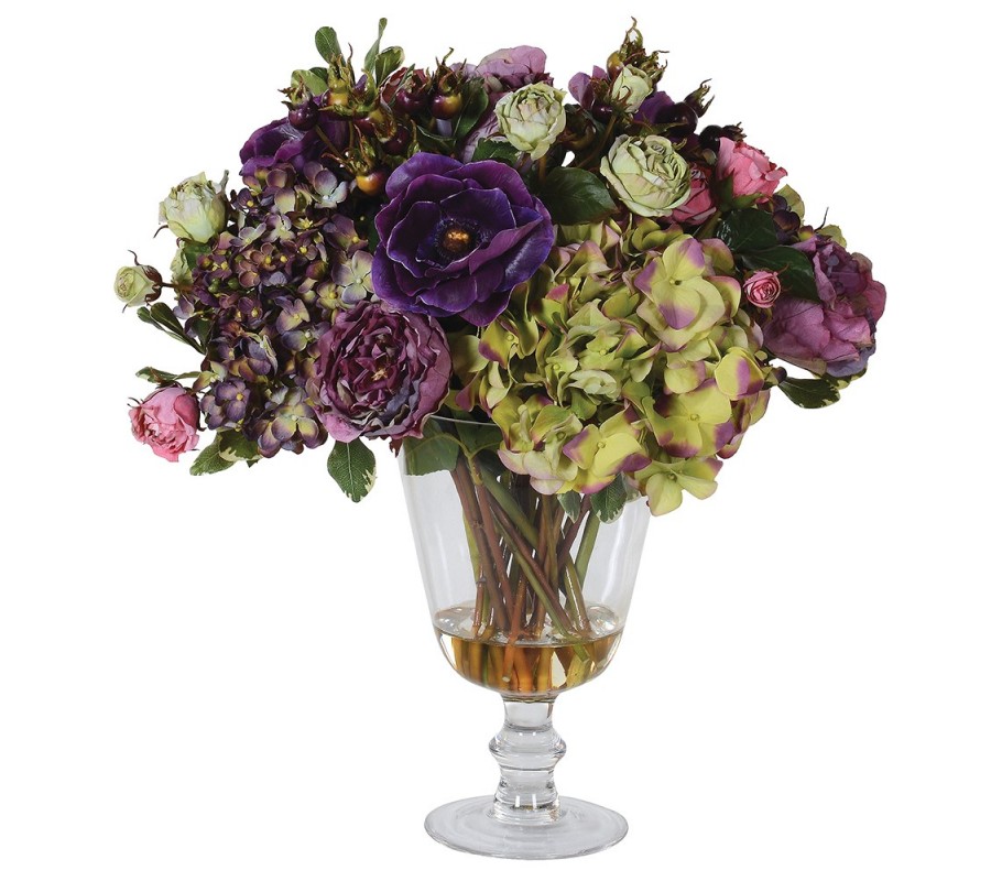 Kytica pozostáva z bohatej kombinácie viacfarebných umelých kvetov, ako sú hortenzie, pivonky, ruže či iskerníky, v tónoch fialovej, zelenej, ružovej a smotanovej. Kvety sú detailne spracované s dôrazom na textúru okvetných lístkov a lupeňov, čím vytvárajú luxusný vzhľad.