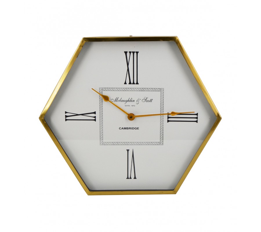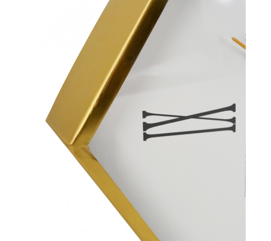 Štýlové nástenné hodiny Hex sú jedinečný kúsok, ktorý skvelo zapadne do vašej obývačky. Hodiny sú vyhotovené v art deco štýle v šesťuholníkovom tvare. Hodiny rámuje zlatý lesklý geometrický rám, ktorý dodáva hodinám glamour nádych. Hodiny s rímskymi čislami majú výrazné oranžové ručičky, okolo ktorých sa nachádza detailná potlač vo vintage štýle.