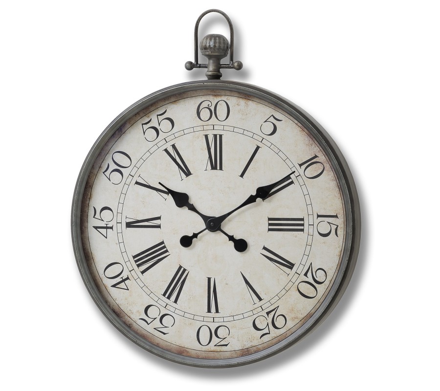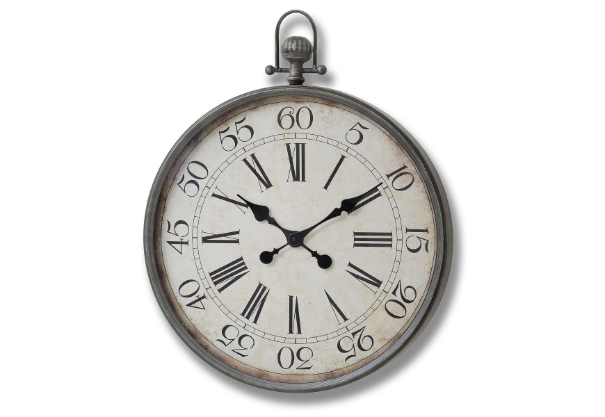 Nástenné kovové hodiny v retro štýle sú zväčšeninou vreckových hodiniek.