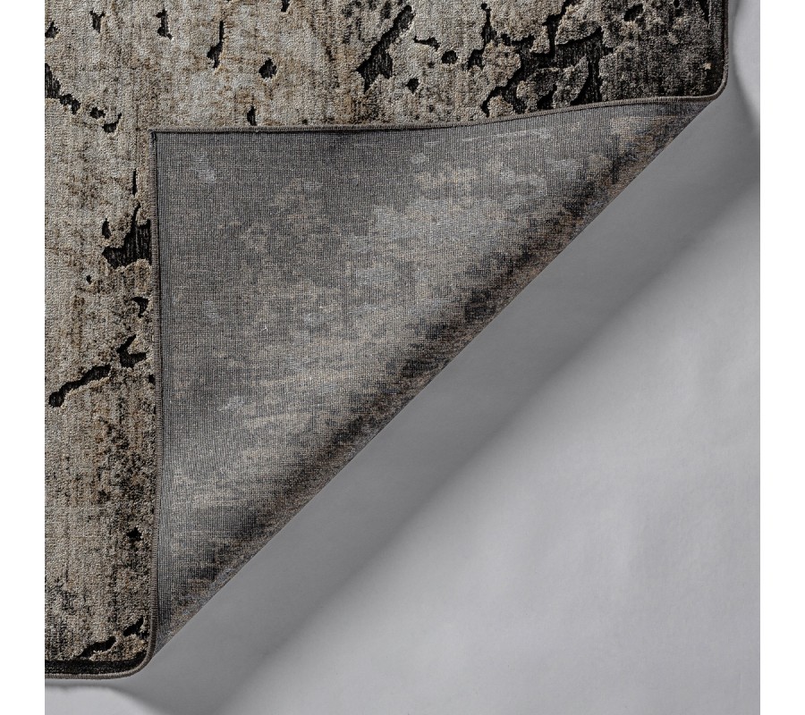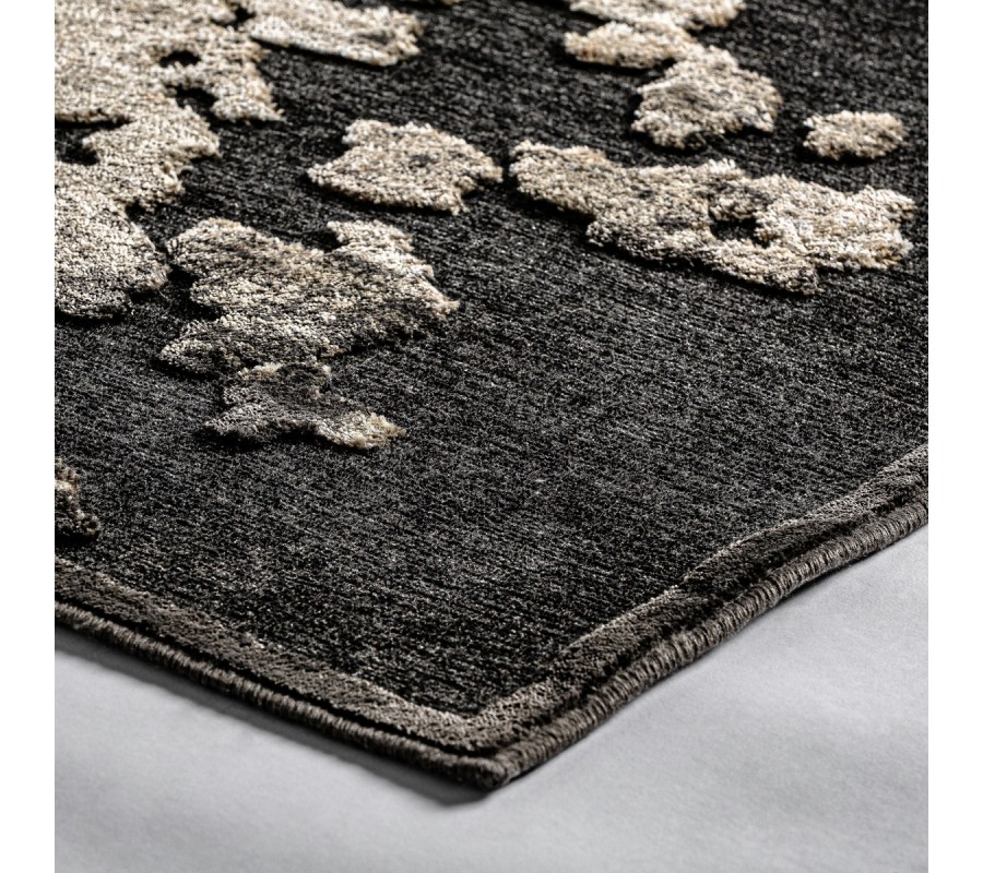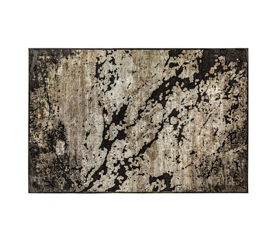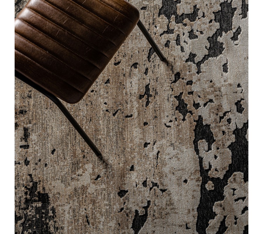 Farebné prevedenie kombinuje čierny podklad s nepravidelnými plochami v odtieňoch hnedej, béžovej a sivej, čím vzniká kontrastný a elegantný vizuálny efekt. Tento koberec dodáva priestoru hĺbku, štruktúru a charakter.