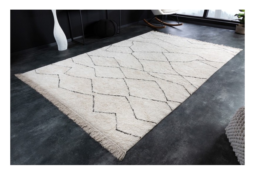 Doprajte svojmu interiéru moderný prvok v podobe dizajnového koberca Hasla. Tento štýlový koberec disponuje vyhotovením zo 100%-nej bavlny v slonovino bielej až krémovej farbe s dĺžkou vlasu približne 1 cm. Dizajnové prevedenie koberca je obohatené o sivé vzory v podobe prepojených "zig-zag" kľukatých línií. Moderný vzhľad koberca Hasla je v neposlednom rade doplnený strapcami po bočných stranách, ktoré umocnia útulný vzhľad koberca. Vďaka svojmu rozmeru 290x190cm je koberec Hasla vhodným kúskom na umiestnenie do priestrannejších interiérov a izieb, pričom jeho vzhľad najlepšie vynikne v obývačkách, spálňach, či pracovniach v kombinácií s moderným kovovým nábytkom napríklad z kolekcií Industria Negra alebo Industria Durante.