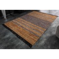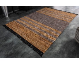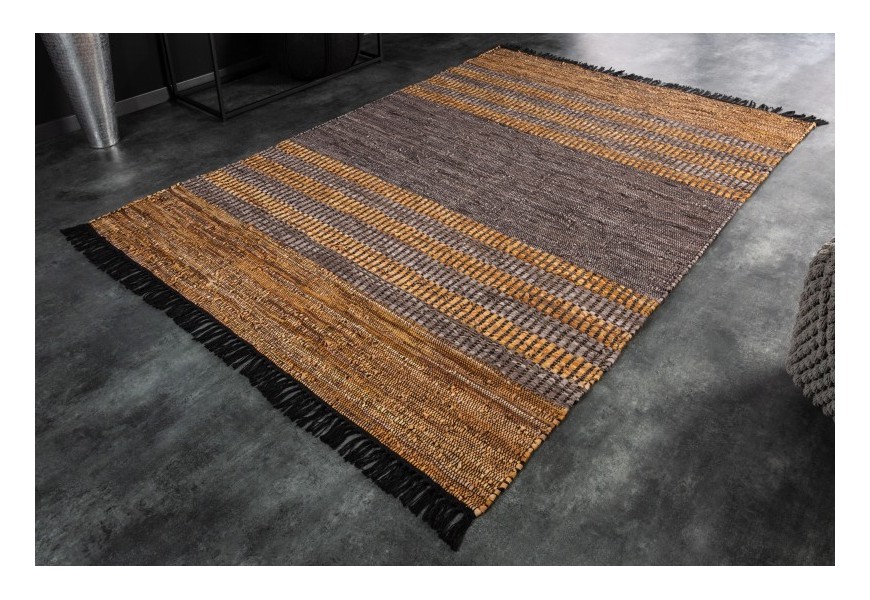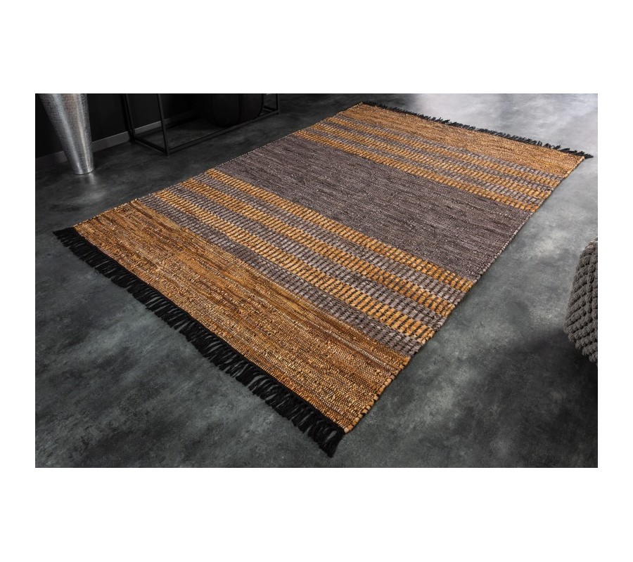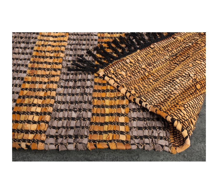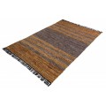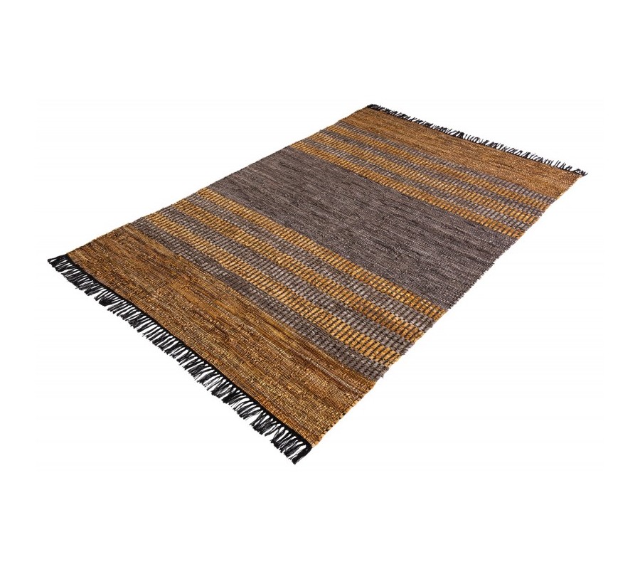Štýlový koberec Parra spája kvalitné vyhotovenie s dizajnom v etno štýle. Kvalitu vyhotovenia Vám zaručí kombinácia bavlny a pravej kože (10% bavlna, 85% pravá koža) spájaná jutou, ktorá je perfektným výberom pre doplnenie prírodných materiálov. Prevedenie kože sa nesie v hnedej, sivej a žlto-hnedej farbe, čo je dizajnovo doplnené čiernymi strapcami po bočných stranách koberca. Originálne prevedenie kože sa nesie v samostatných prepojených kúskoch, vďaka ktorým vzniká unikátny vzhľad podobný štýlu etno. Dizajnový koberec Parra odporúčame kombinovať v moderných interiéroch s etno dekoráciami, s kovovým alebo masívnym nábytkom, alebo taktiež aj s koženými kreslami a sedačkami.