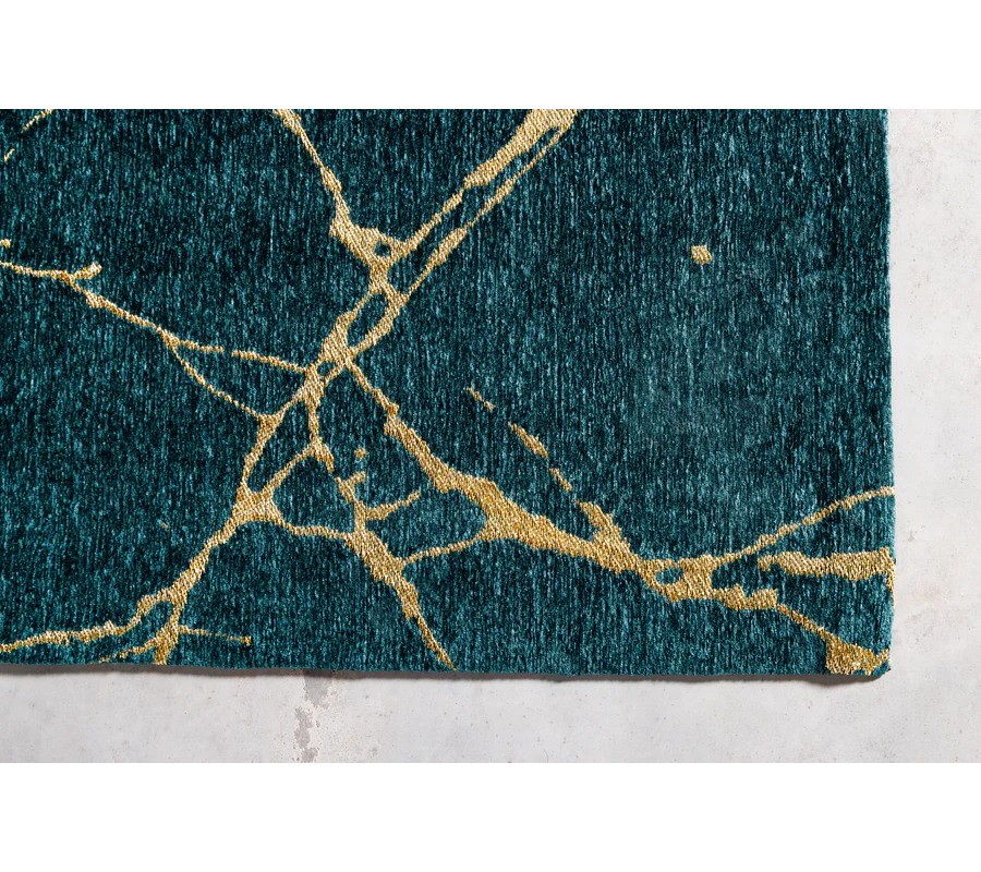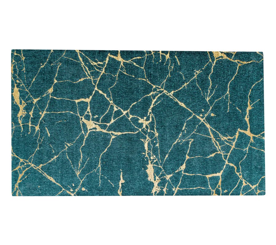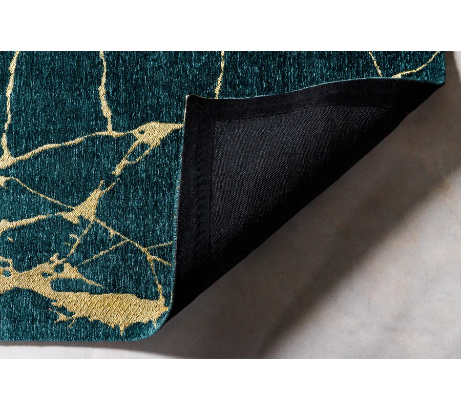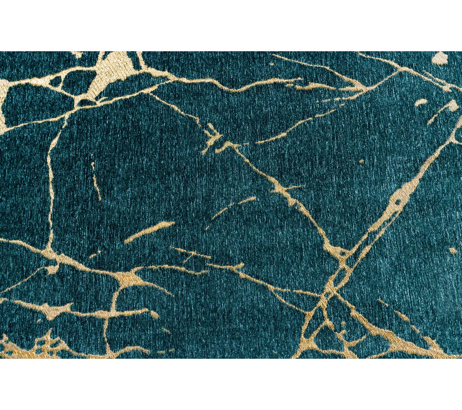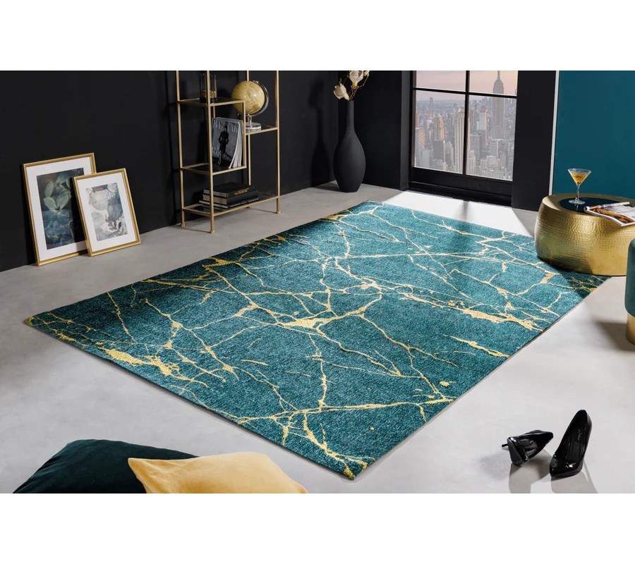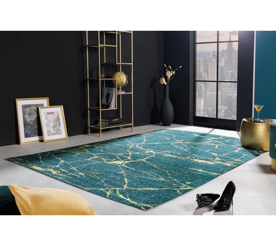 Koberec Tyron obdĺžnikového tvaru vyniká výrazným mramorovým dizajnom, ktorý kombinuje hlboký tyrkysovo zelený odtieň s jemnými zlatými líniami. Tento kontrast vytvára elegantný a luxusný vzhľad, ktorý upúta pozornosť a dodáva priestoru jedinečný charakter. Povrch koberca je hladký, mäkký na dotyk a príjemný na chôdzu, vďaka čomu pôsobí komfortne a esteticky zároveň.