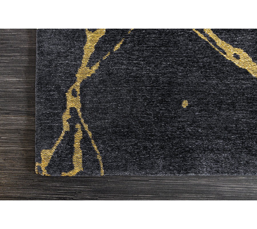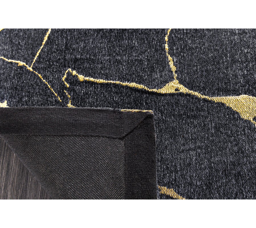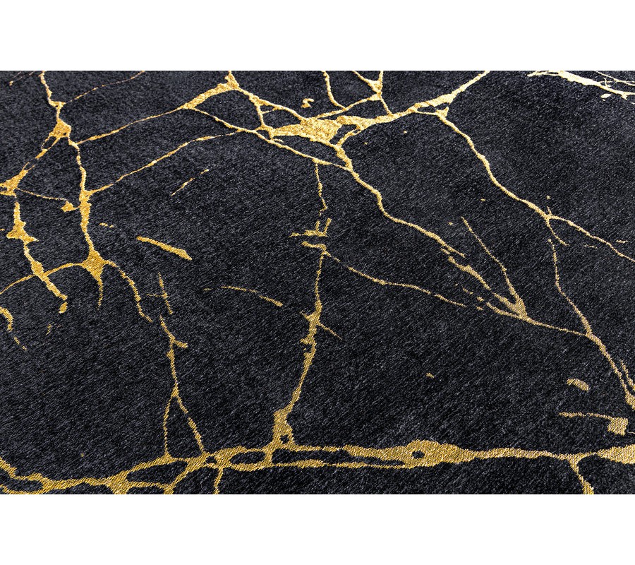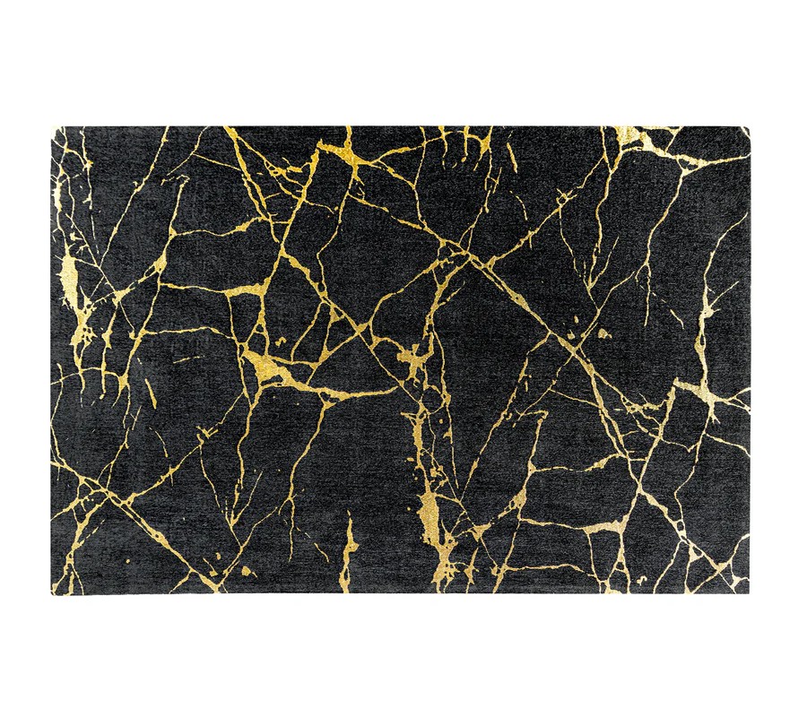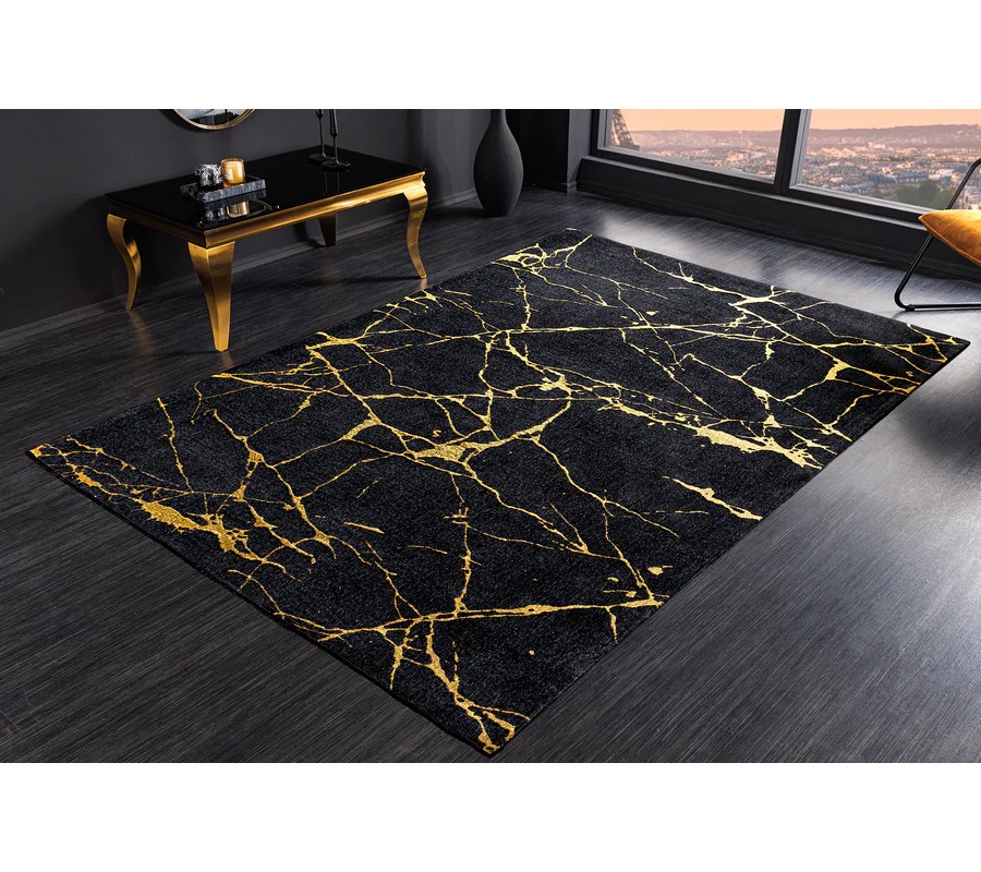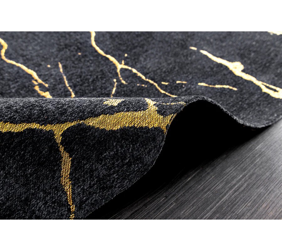 Koberec Tyron obdĺžnikového tvaru v elegantnej čiernej farbe s výrazným mramorovým dizajnom vo zlatých líniách prináša luxusný a moderný vzhľad. Povrch je hladký a jemný na dotyk, vďaka čomu pôsobí komfortne a esteticky. Materiál z bavlny a mikrovlánka zaisťuje jeho mäkkosť a jednoduchú údržbu, pričom zachováva vysokú kvalitu a odolnosť. Koberec je vďaka materiálom vhodný položiť aj na podlahové kúrenie.