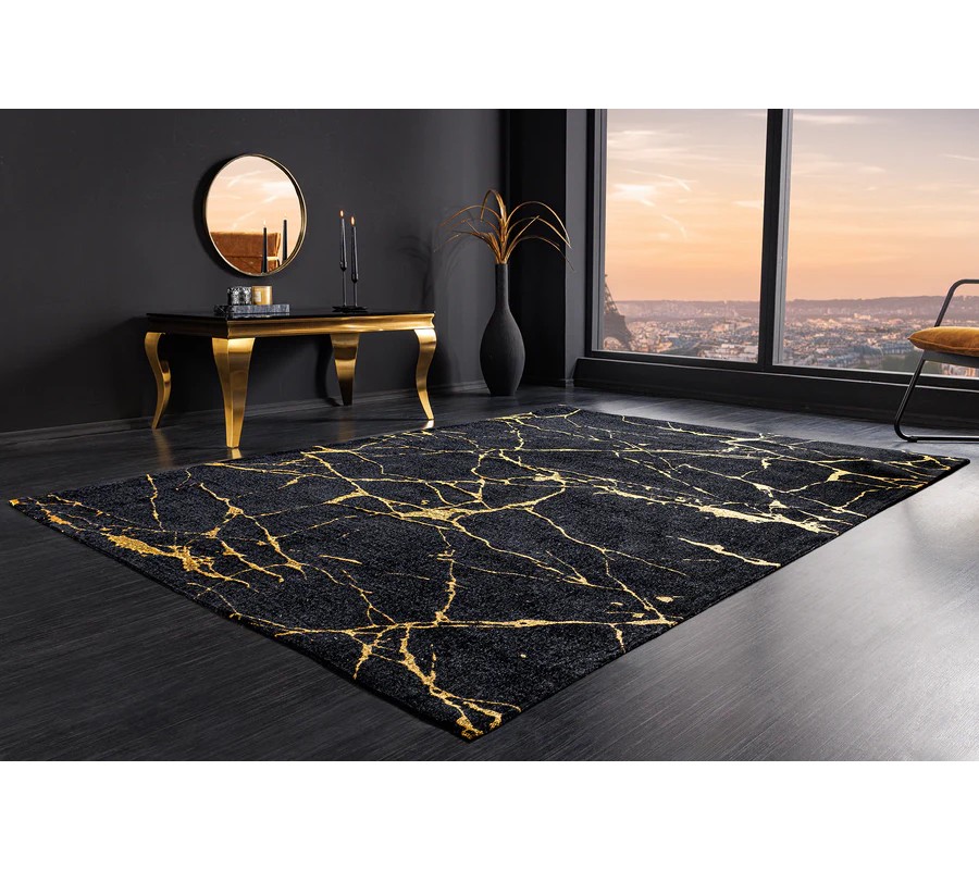 Štýlový glamour obdĺžnikový koberec Tyron v čiernej farbe so zlatými detailmi s dizajnom mramoru 240 cm