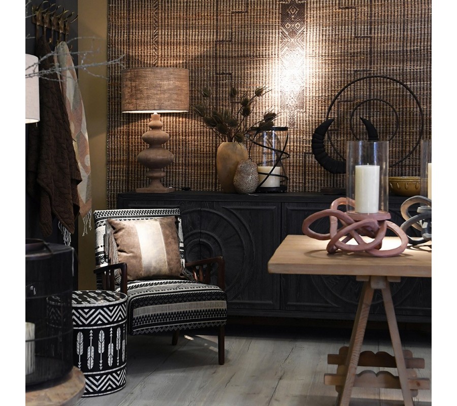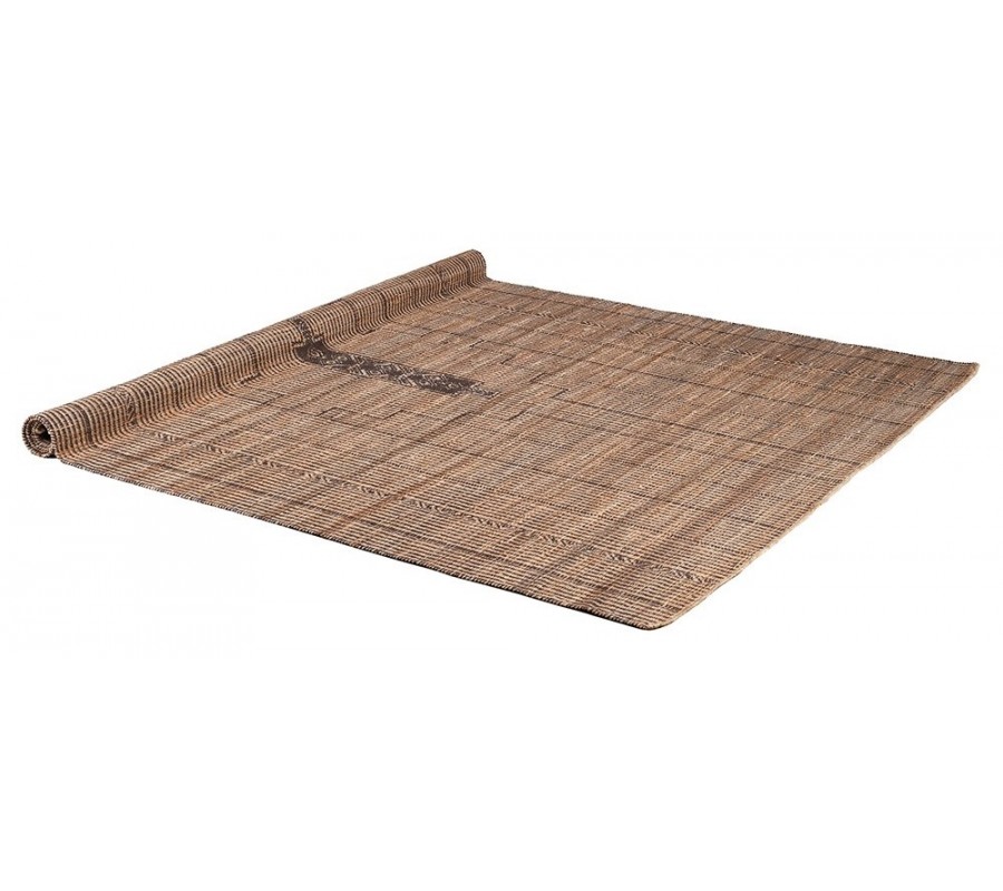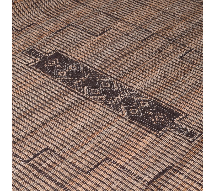 Koberec Rami predstavuje výnimočný spoj remeselného spracovania a kultúrne inšpirovanej estetiky. Je vyhotovený v obdĺžnikovom tvare a ručne tkaný z kombinácie prírodnej juty a bavlny, ktoré mu dodávajú pevnosť, ekologickú hodnotu a autentický vzhľad. Jeho povrch má jemne štruktúrovaný raster, v ktorom sa striedajú svetlé a tmavé priadze v prírodných béžových a hnedých odtieňoch.