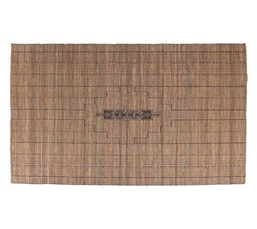 Stred koberca zdobí výrazný geometrický motív v tmavohnedej farbe, ktorý je kompozične zakomponovaný tak, aby pripomínal dekoratívne prvky tradičných západoafrických a saharských textílií. Vzor má symetrickú výstavbu a ohraničuje ho tvarovaný rám vytvorený zo zlomenej línie, ktorý vnáša do koberca vizuálnu rovnováhu a rytmus.