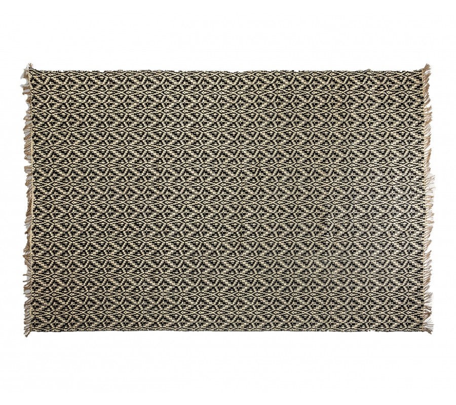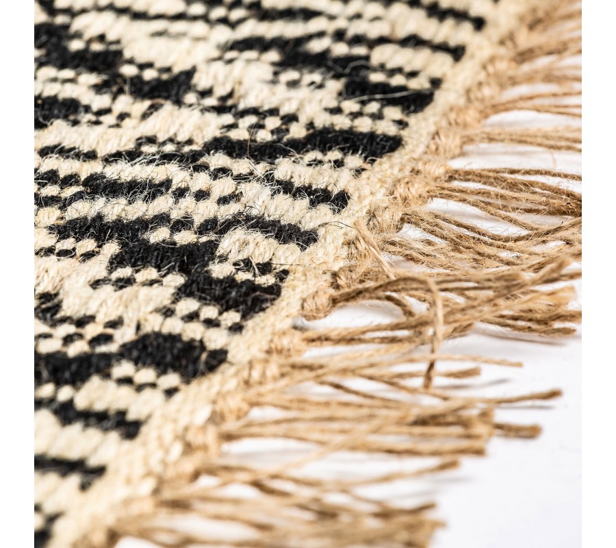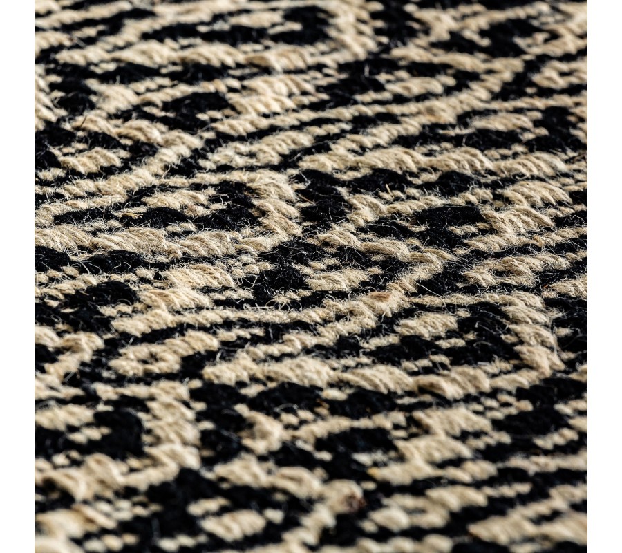 Koberec je utkaný z prírodných jutových vlákien, ktoré sú známe svojou pevnosťou, odolnosťou a štruktúrovaným povrchom, tento exotický materiál dokonale podčiarkuje jeho koloniálny dizajn. Vzor pozostáva z opakujúcich sa drobných geometrických motívov v čiernej a béžovej farbe, ktoré vytvárajú dojem tradičnej orientálnej výšivky. Husto tkaná látka a kontrastné farebné ladenie zvýrazňujú jeho etno charakter.