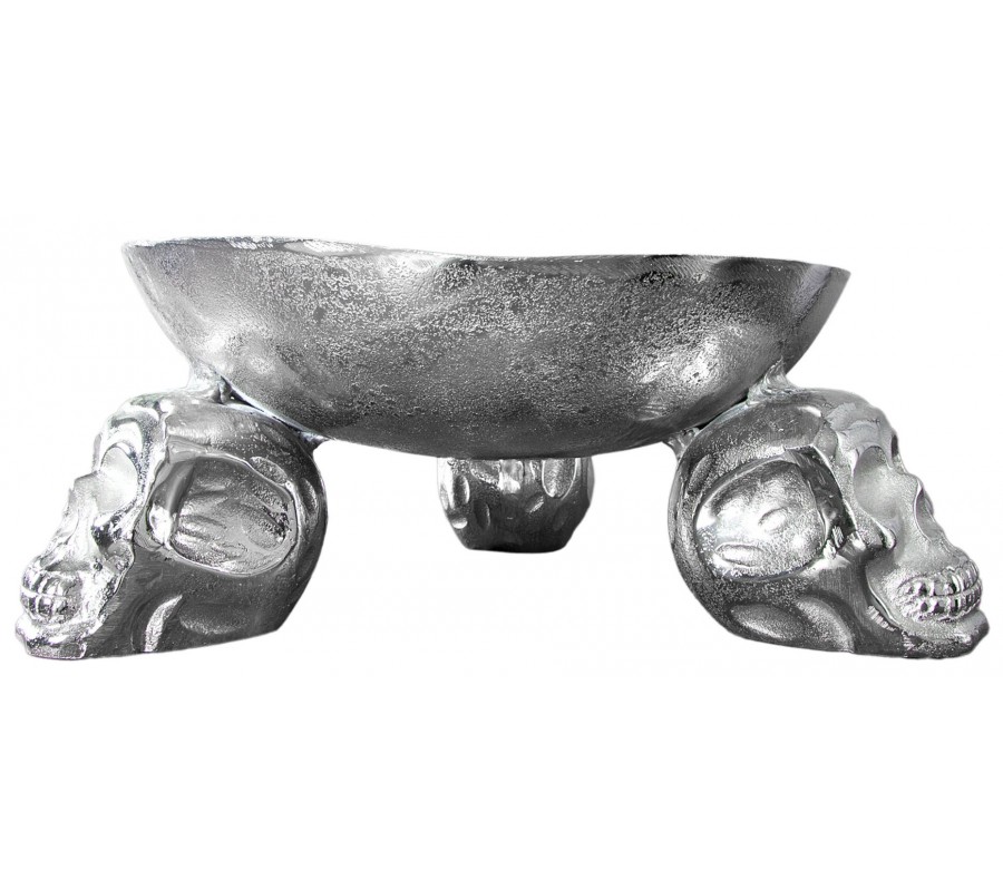 Extravagantná originálna dekoračná misa na ovocie Lebka zaujme na prvý pohľad svojim tvarom. Nohy dekoračnej misy sa skladajú z 3 dekoračných lebiek. Celá dekoračná misa na ovocie je vyrobená z kvalitnej zliatiny hliníka v striebornej farbe. Táto misa pôsobí veľmi luxusne aj keď sa v nej nenachádza ovocie. Rozmery: 35 cm x 15 cm x 35 cm (ŠxVxH) Lebka: 5 cm x 10 cm x 10 cm (ŠxVxH).