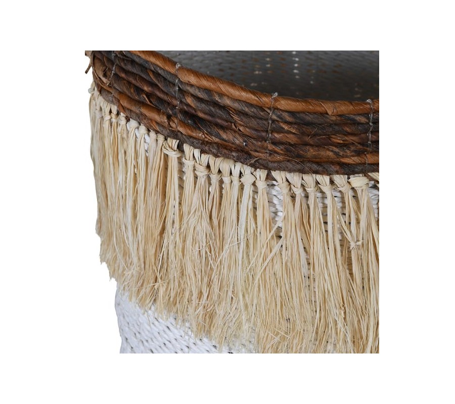 Štýlový set dvoch dekoratívnych košov Pelosi ponúka praktický úložný priestor vhodný do každej obývačky, spálne či pracovne ladenej vo vidieckom či prírodnom etno štýle. Zaujme svojím naturálnym prevedením, ktorého základ tvorí ratanový výplet v troch rôznych farbách. Spodná časť sa nesie v elegantnej bielej a vrchný lem zdobia prúty prírodnej tmavohnedej, ktorý dopĺňajú strapce v svetlohnedej farbe. Vzniká tak zaujímavý nadčasový dizajn, ktorý v prepojení s prírodným materiálom vytvára unikátny doplnok s praktickým účelom. Koše Pelosi vhodne poslúžia na uskladnenie teplých diek či vankúšov, časopisov či rôznych iných predmetov. Vhodne vyniknú v priestoroch zariadených masívnym nábytkom a s prírodnými doplnkami.