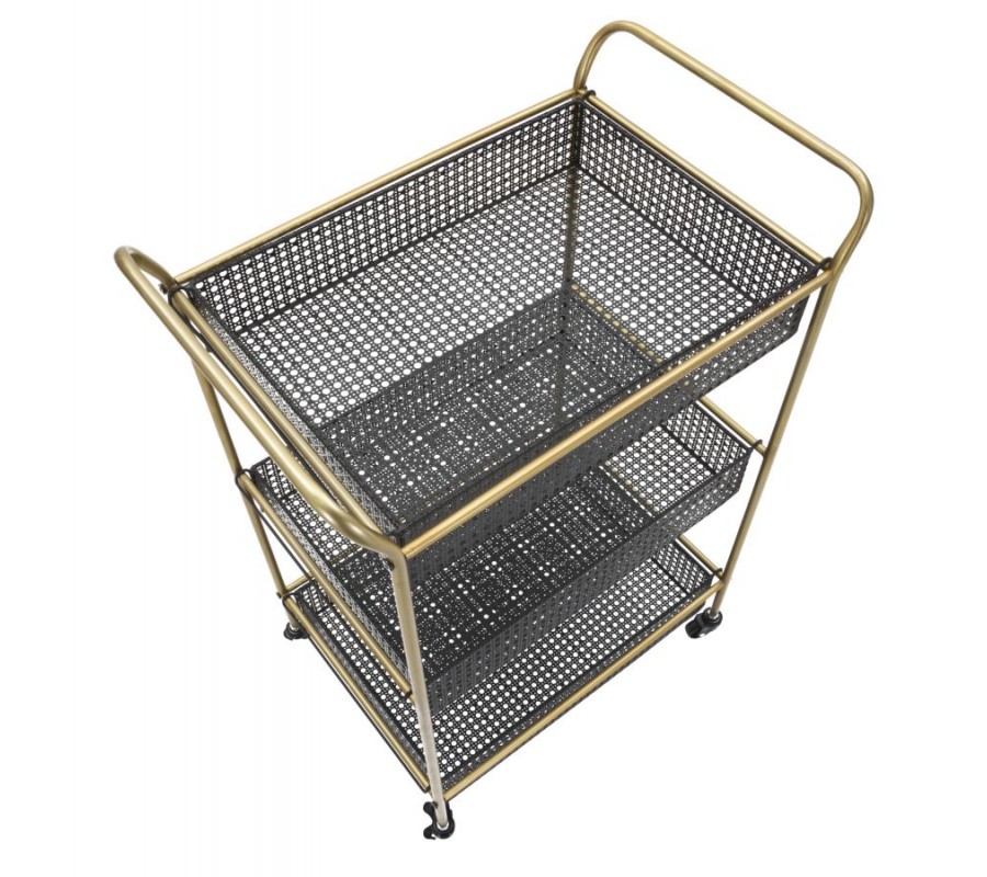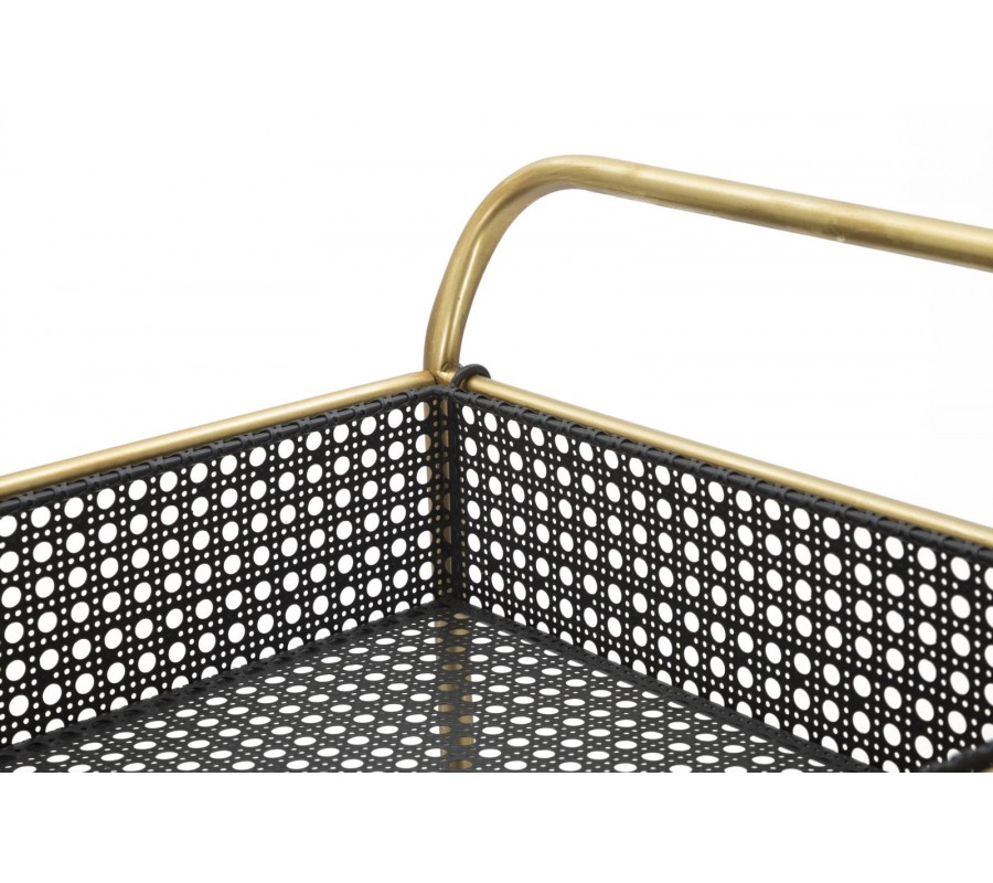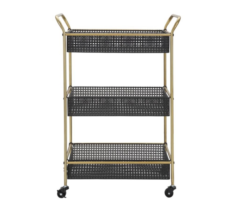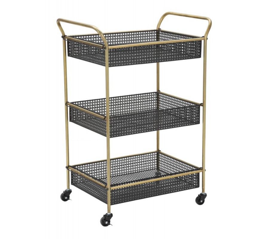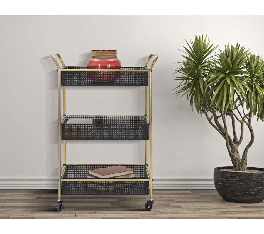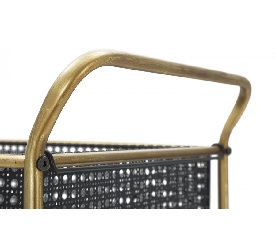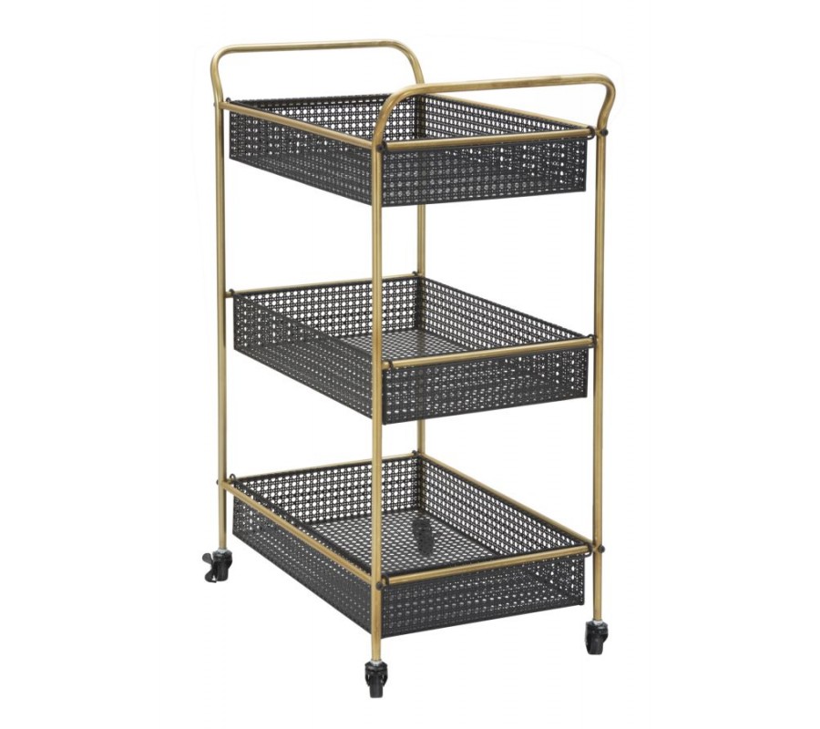Elegantný servírovací vozík Zero v glamour a art deco štýle ponúka praktické využitie ako odkladací box v kuchyni, jedálni alebo obývačke. Je vyrobený z kovu so zlatou konštrukciou, ktorá dodáva luxusný vzhľad. Vozík má tri úložné boxy v čiernej farbe s jemnou perforáciou po celom obvode, ktorá umožňuje prúdenie vzduchu a zároveň vytvára dekoratívny efekt. Boxy sú uložené na háčikovom princípe, čo znamená, že sa dajú jednoducho vybrať a premiestniť. Vozík je vybavený kolieskami, vďaka ktorým sa ľahko presúva podľa potreby. Má obdĺžnikový tvar a pevná konštrukcia zaručuje stabilitu.