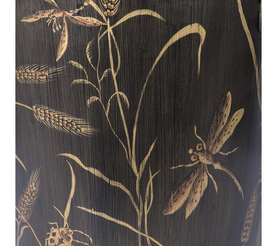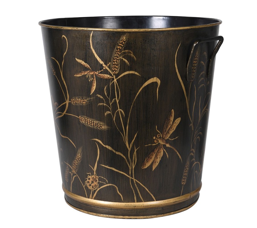 Retro okrúhle dekoratívne vedro Eloise zo železa v čiernej farbe s kresbou s prírodným motívom v zlatej farbe s úchytkami 46 cm