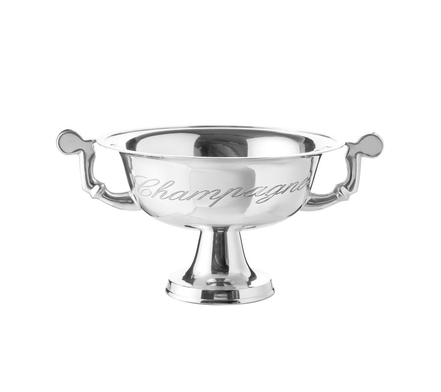 Vintage nádoba Champagne je elegantný dekoračný kúsok s okrúhlym tvarom, ktorý upúta pozornosť svojím vysoko lesklým chrómovým povrchom. Je vyrobená z odolného kovu a nesie na sebe gravírovaný nápis "Champagne" v šikmom písme, ktorý odkazuje na noblesu a štýl starých francúzskych domov.
