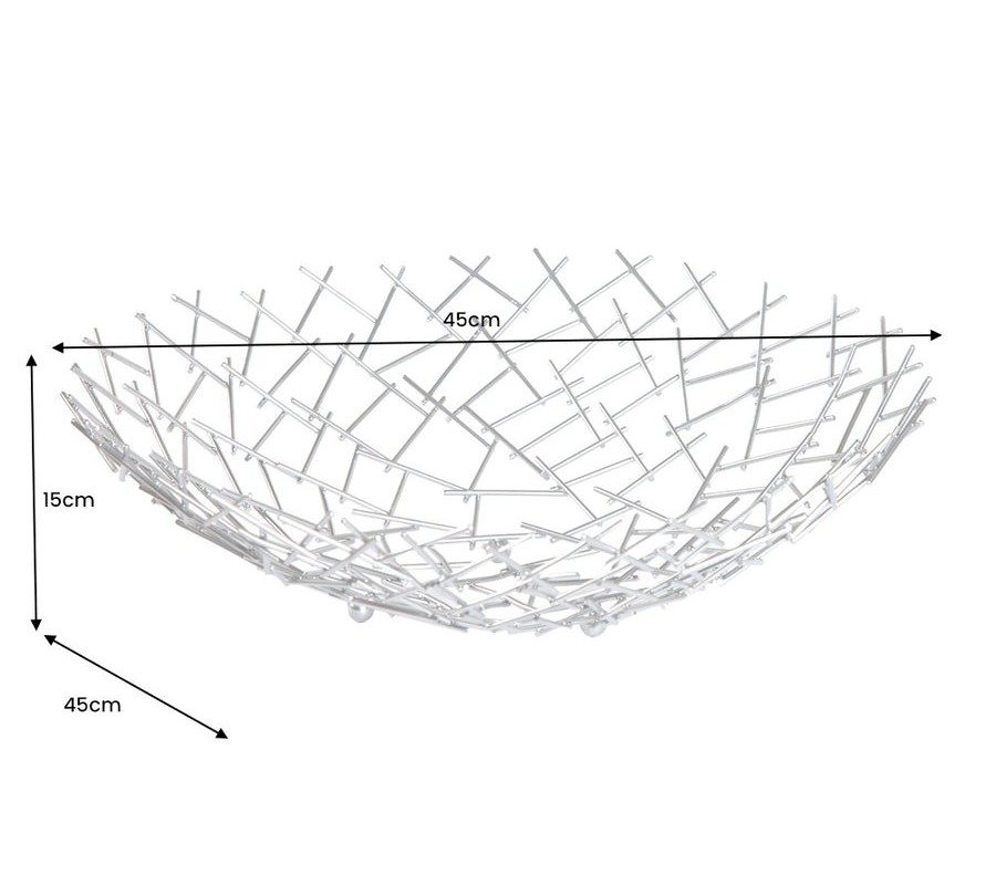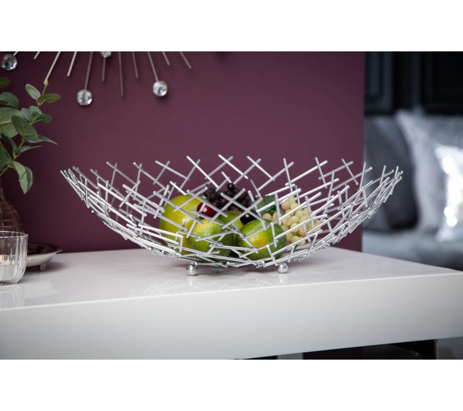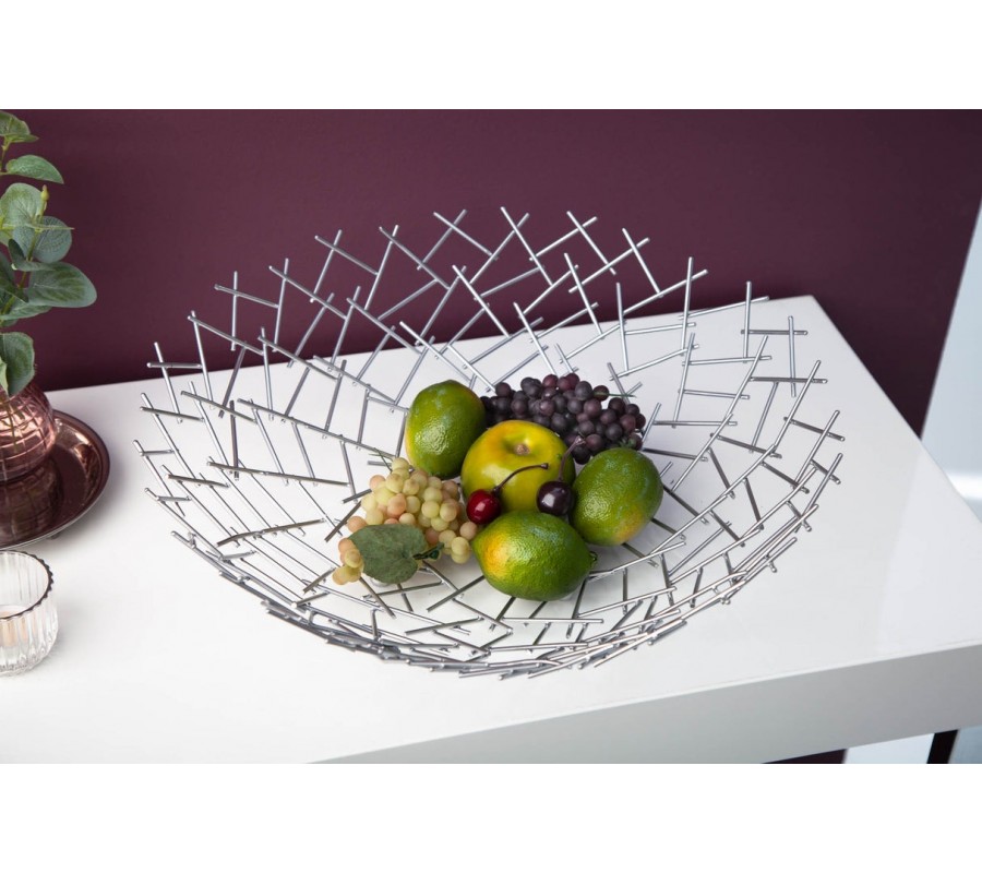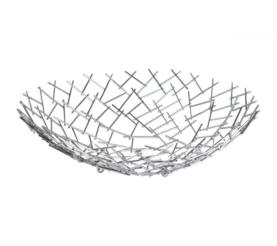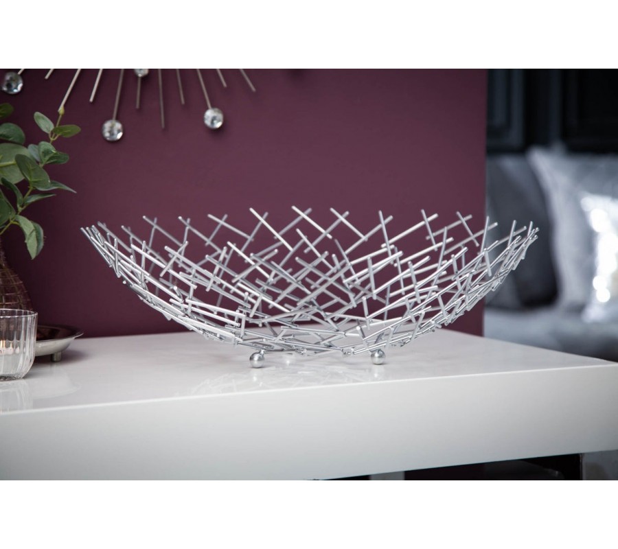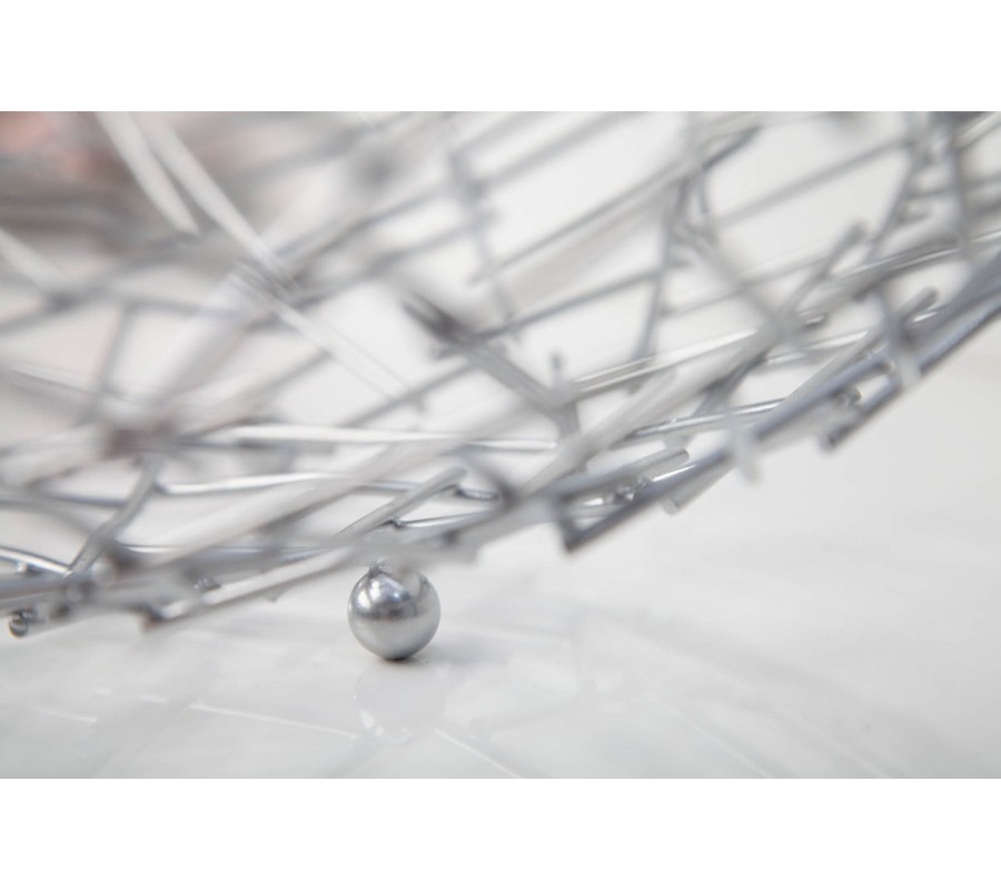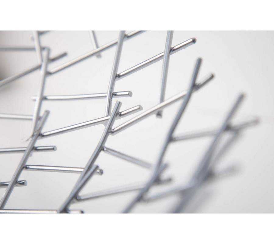 Dekoračná misa Weave zaujme svojim netradičným atypickým tvarom a konštrukciou z tenkých kovových prvkov, ktoré vytvárajú vzdušnú sieť v tvare okrúhlej misy. Jednotlivé podlhovasté strieborné časti sú prepletené v diagonálnom vzore, čo vytvára efekt modernej geometrie a zároveň pôsobí ľahko a elegantne.
