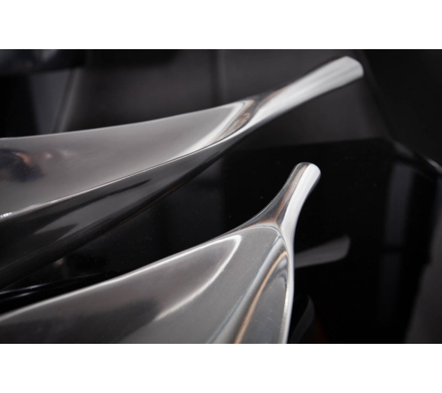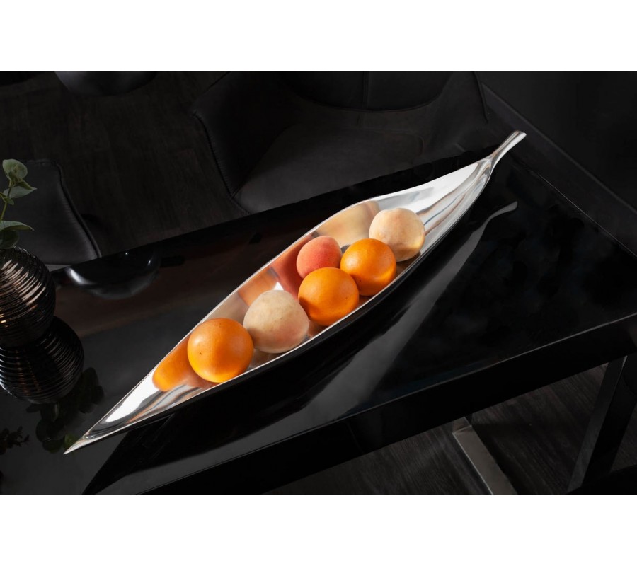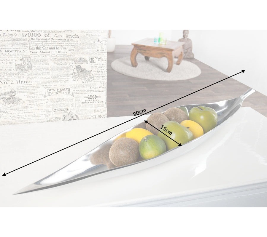 Dekoračná misa Leaf okamžite upúta svojím podlhovastým tvarom pripomínajúcim list, jemne sa zužujúcim smerom k okrajom. Vyrobená je z odolného kovu a pokrytá lesklou chrómovou vrstvou, ktorá jej dodáva luxusný zrkadlový efekt. Vnútorný priestor je plynulo zaoblený, vďaka čomu misa pôsobí uhladene a elegantne.