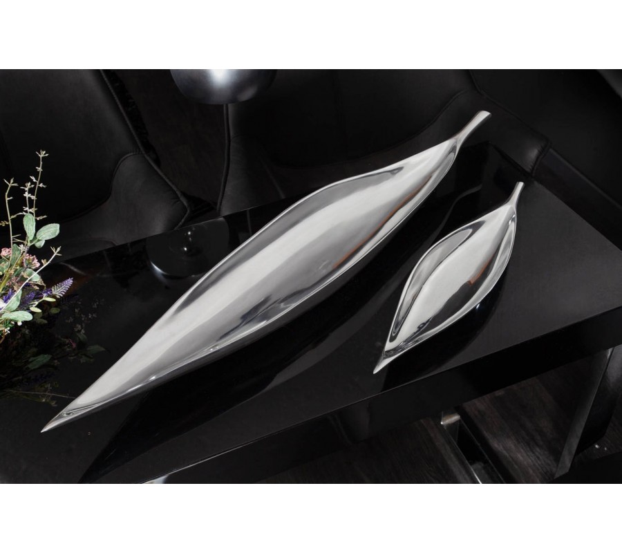 Moderná veľká dekoračná misa na ovocie Leaf z kovu v striebornej farbe s lesklým povrchom v tvare listu 80 cm
