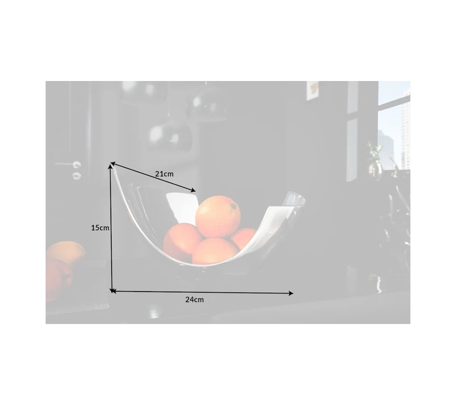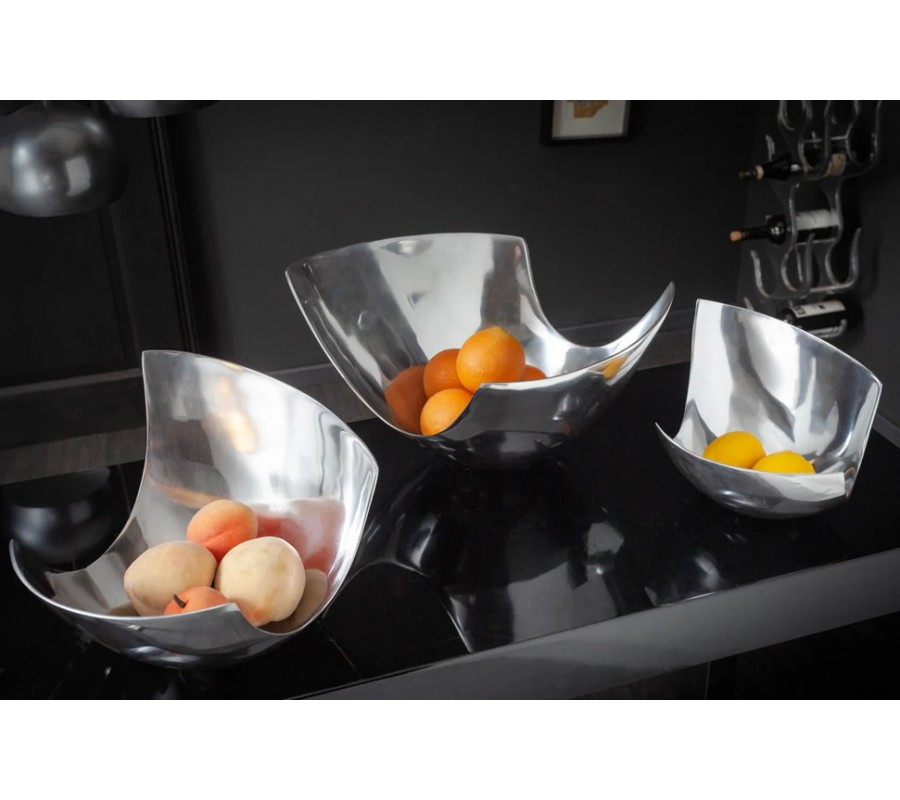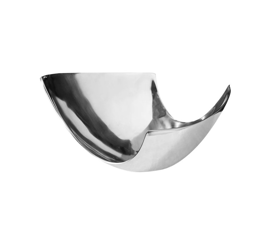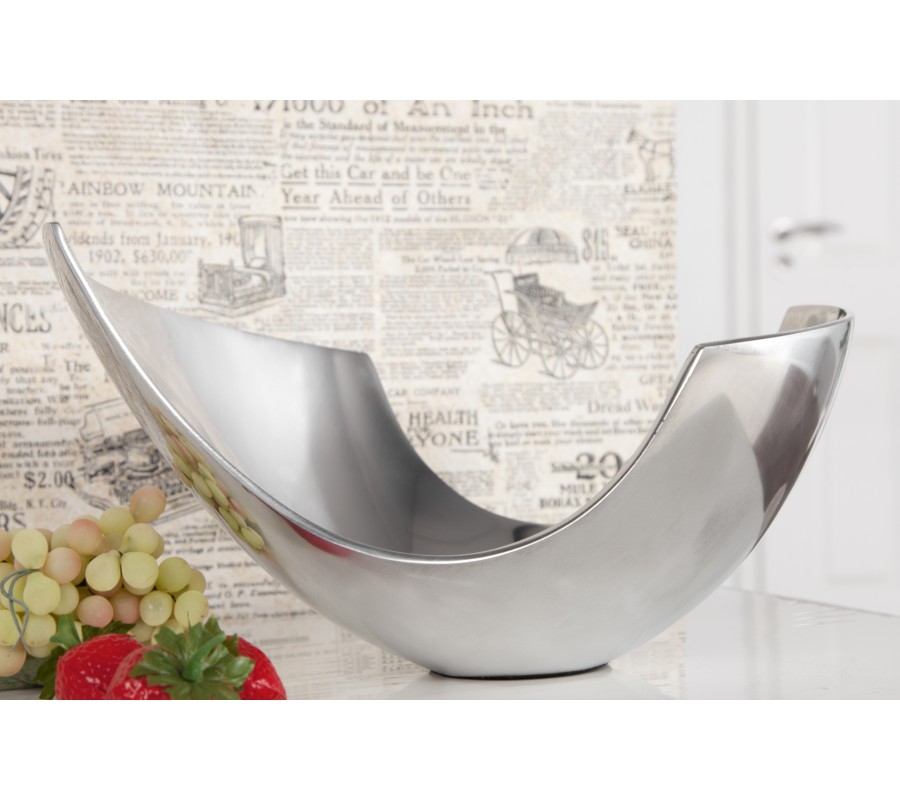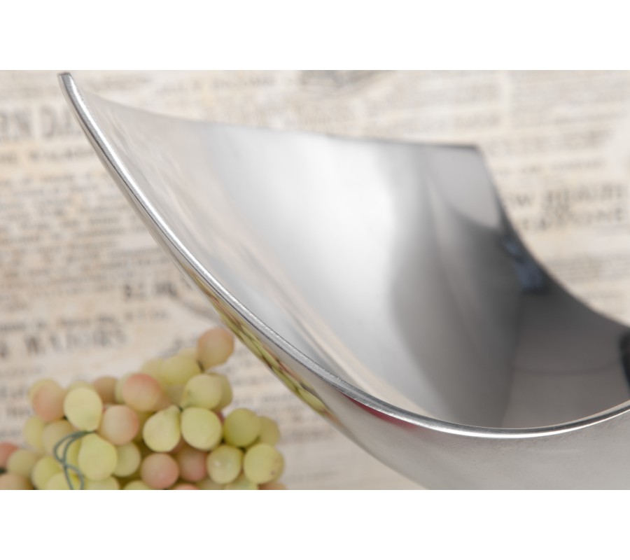 Misa je vyrobená z kovovej zliatiny, vďaka čomu je pevná a odolná. Povrchová úprava v metalickej striebornej farbe odráža svetlo a vytvára zaujímavý efekt. Tvar misky je inšpirovaným abstraktným umením. Je štylizovaná ako obdĺžnikový kovový plát, ktorý je v strede výrazne prehnutý. Vytiahnuté hranaté okraje v rozličnej výške tvoria asymetrický siluetu a oblúky na bočných stranách zasa pôsobia elegantným plynulým dojmom. Tento dekoračný predmet je určený len na suché použitie, nakoľko kontakt s nadmernou vlhkosťou môže poškodiť farbu.