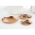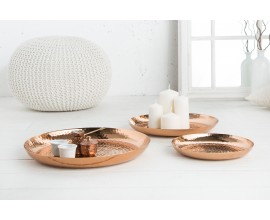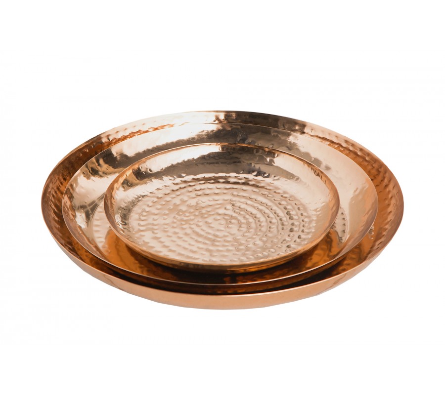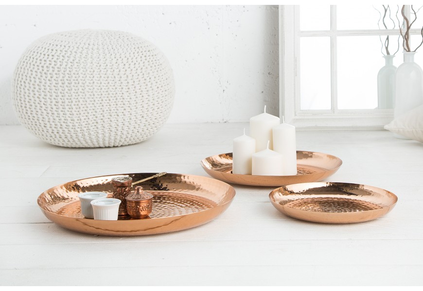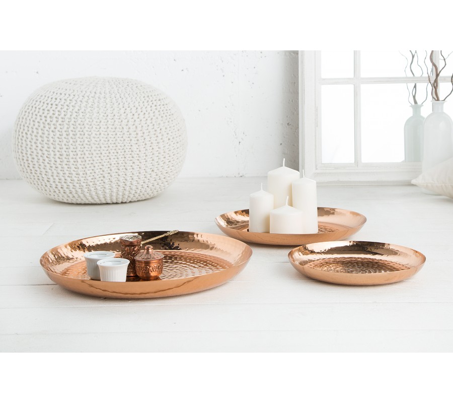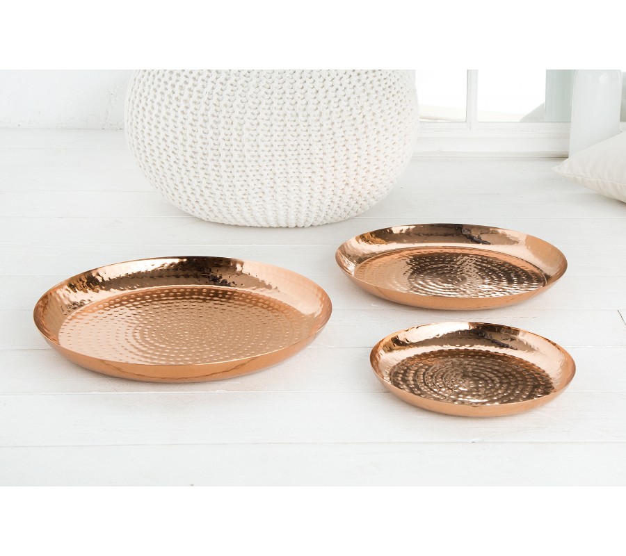 Dekoratívny set tanierov Orient je unikátnym ručne vyrobeným kúskom do vašej domácnosti. Taniere sú medenej farby a sú vyrobené z kovu. Povrch bol vylepšený technikou kladenia .Ochrana proti poškriabaniu na spodnej strane misiek. Na tanieroch sa môžu nachádzať menšie hrbole, čo je spôsobené ručnou výrobou, a teda je každý kus jedinečný.