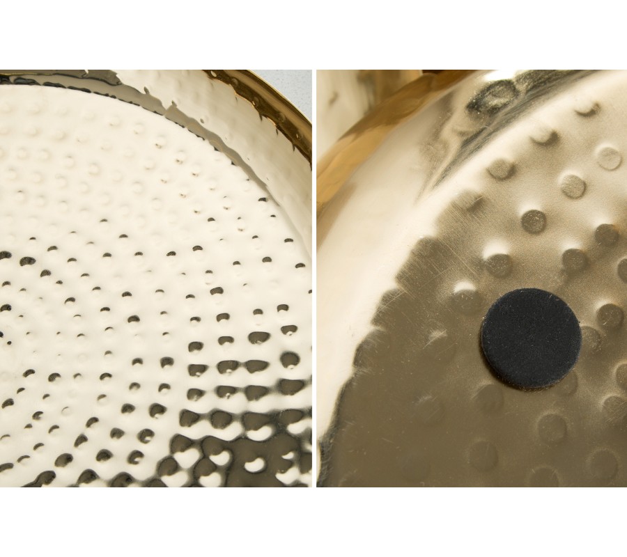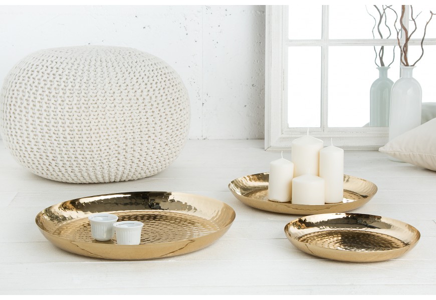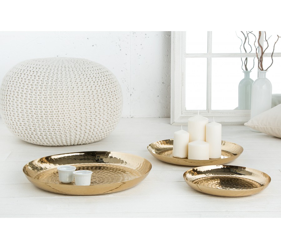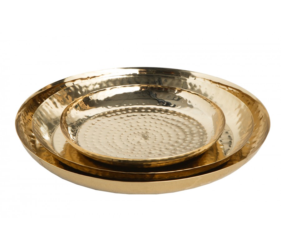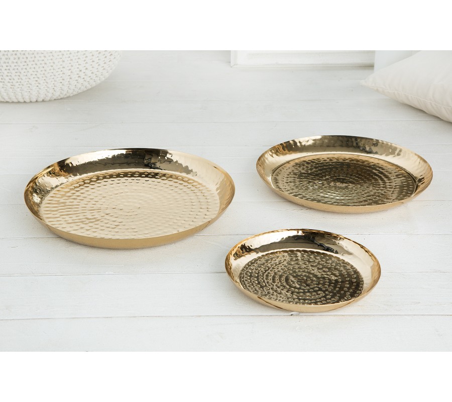 Dekoratívny set tanierov Orient je unikátnym ručne vyrobeným kúskom do vašej domácnosti. Taniere sú zlatej farby a sú vyrobené z kovu Povrch bol vylepšený technikou kladenia .Ochrana proti poškriabaniu na spodnej strane misiek. Na tanieroch sa môžu nachádzať menšie hrbole, čo je spôsobené ručnou výrobou, a teda je každý kus jedinečný.