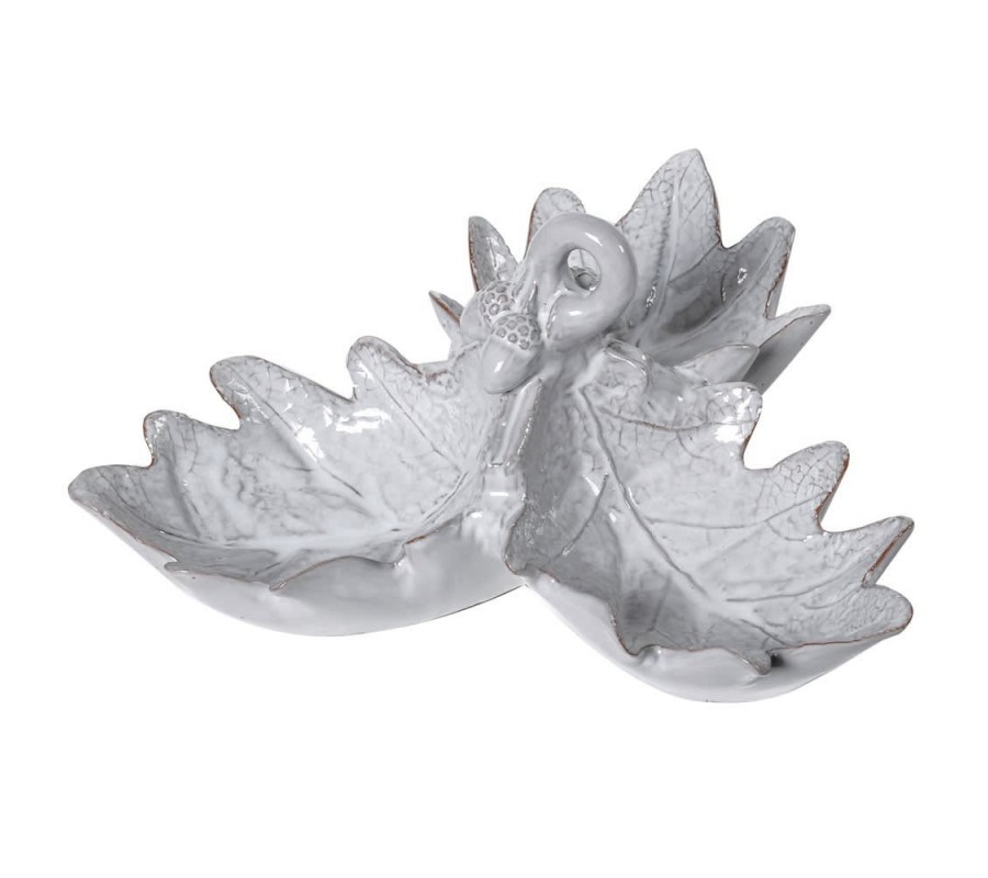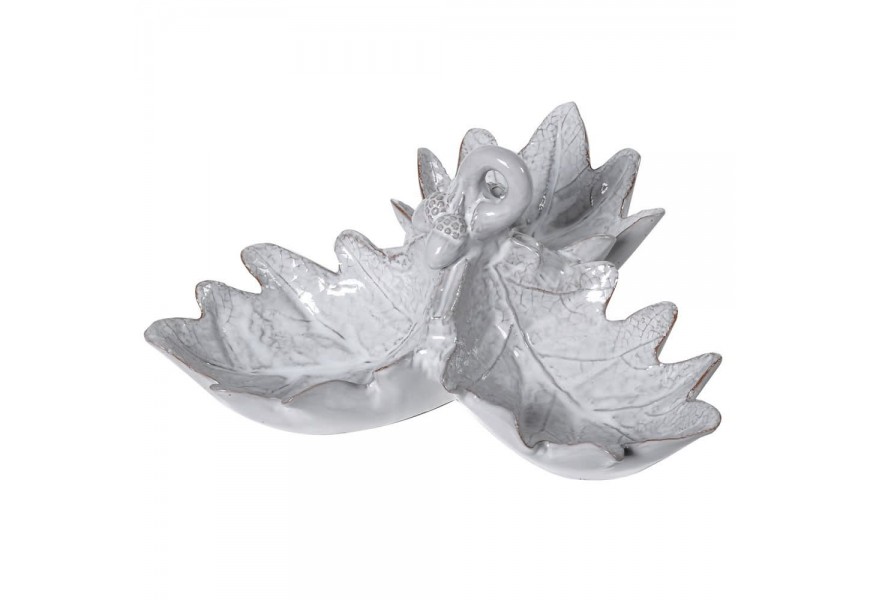 Miska je vyrobená z keramiky a na prvý pohľad vás zaujme atypickou siluetou, zloženou z troch častí. Každú tvorí dubový list s vyzdvihnutými zvlnenými okrajmi, ktoré tvoria bočné strany misky. Prírodný vizuál podčiarkuje aj žilkovanie vo vnútornej časti. Listy sú spojené stonkami, zakončenými slučkou, ktorá uľahčuje manipuláciu s miskou. Na vrchole je tiež umiestnená dekoratívna dvojica žaluďov. Svetlé sivé lakovanie miestami zdobí tmavšia patina, ktorá dodáva tomuto doplnku starožitný nádych a celý dizajn chráni lesklá glazúra.