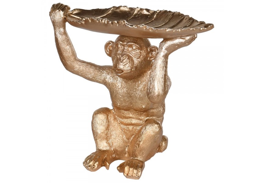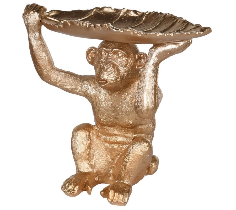 Dekoračná misa Selan je originálny a zábavný doplnok do interiéru, ktorý kombinuje umelecký štýl s praktickým využitím. Zobrazuje detailne spracovanú opicu v sede, ktorá nad hlavou drží veľký list, tvoriaci samotnú misu. Celý objekt je odetý do žiarivej zlatej farby, ktorá vnáša do priestoru glamour atmosféru a hravý lesk.