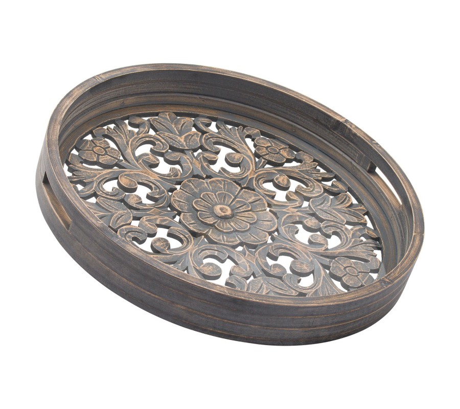 Štýlový set dvoch podnosov Marion je skvelým doplnkom pre každého milovníka ručnej práce a orientálneho štýlu. Kruhové podnosy vyrobené z dreva sú zdobené nádherným a precíznym ručným vyrezávaním. Florálne motívy sa hodia skutočne všade a vďaka neutrálnej hnedosivej farbe ich možno využiť aj vo farebnejšie ladených priestoroch. Set podnosov Marion je praktickým spoločníkom každej orientálne či etno ladenej domácnosti.