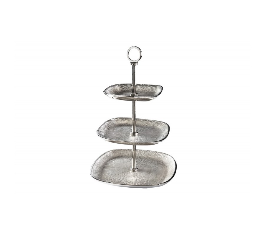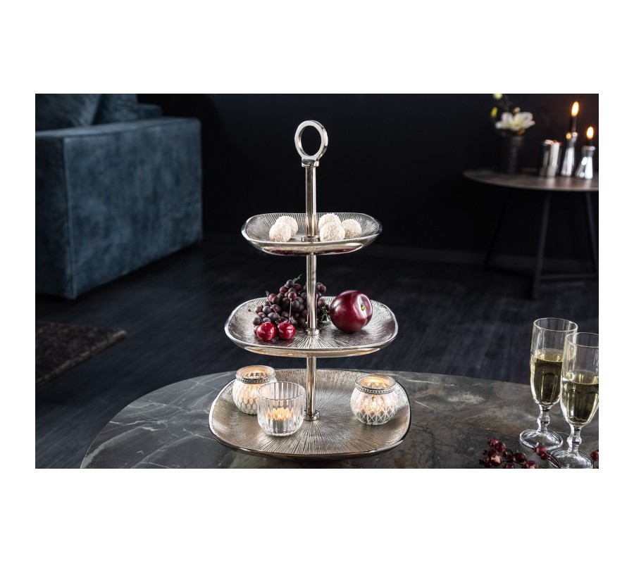 Dizajnový art-deco trojposchodový etažér zákusky Evana z kovu striebornej farby 44cm