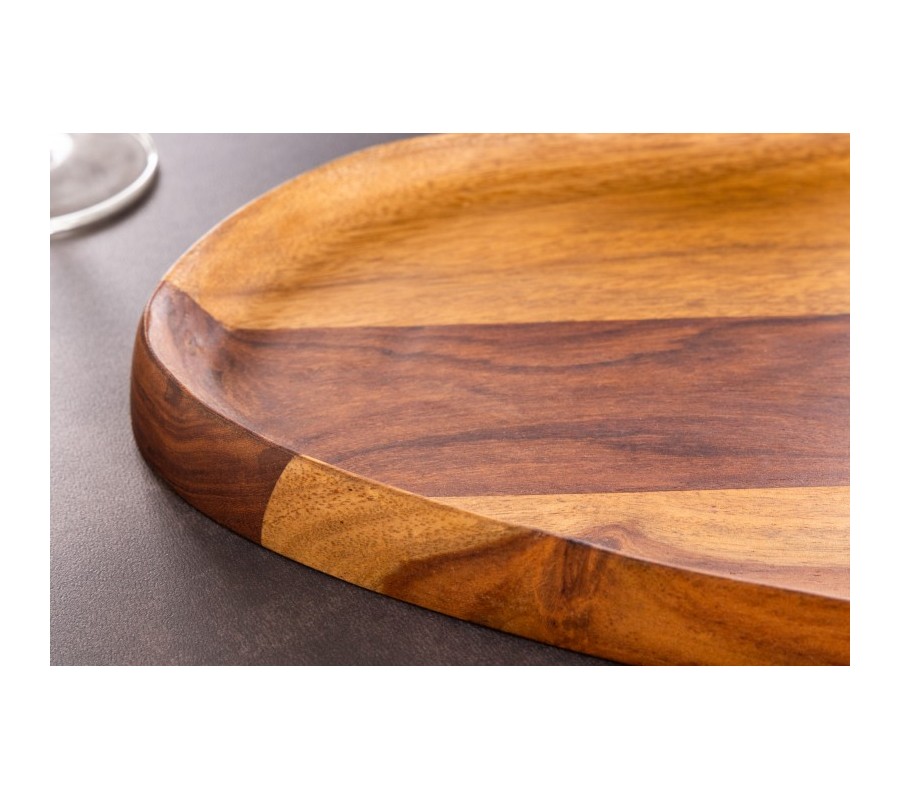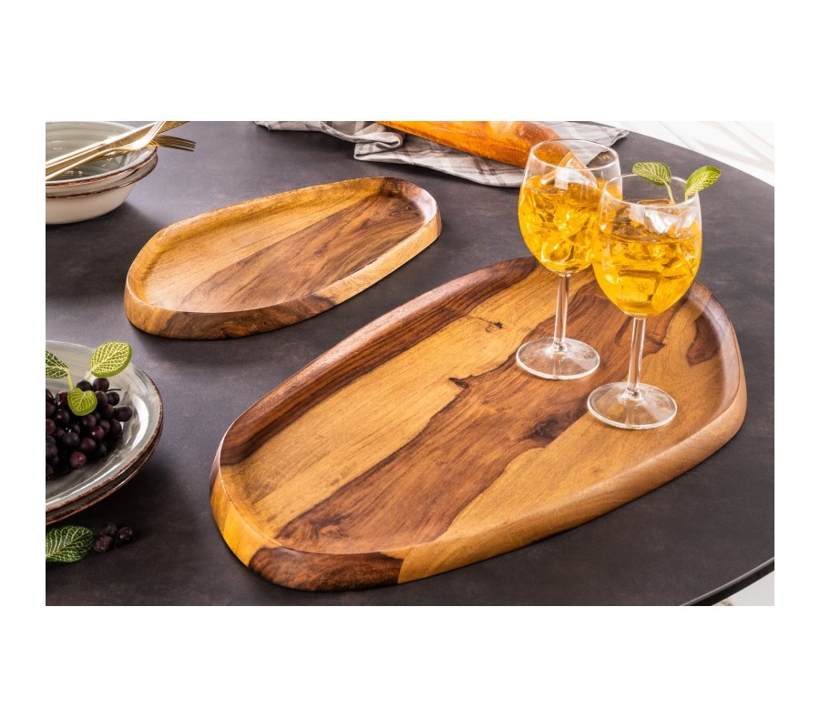 Dizajnový set dvoch podnosov Amanita si nájde uplatnenie v každeu domácnosti. Praktické podnosy možno využiť pri stolovaní, na umiestnenie drinkov či ako tácku na dezerty. Možností využitia je naozaj mnoho, a tak tento univerzálny kúsok nesmei chýbať ani vo vašej domácnosti! Okrem praktickej funkcie môžu tácky zaujať aj svojím elegantným prevedením z masívneho dreva sheesham. Nesú sa v prírodnej hnedej farbe a na povrchu možno vidieť aj krásnu kresbu dreva. Nepravidelné oválne tvary umocňujú naturálny nádych a dodávajú setu Amanita unikátny vzhľad.