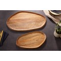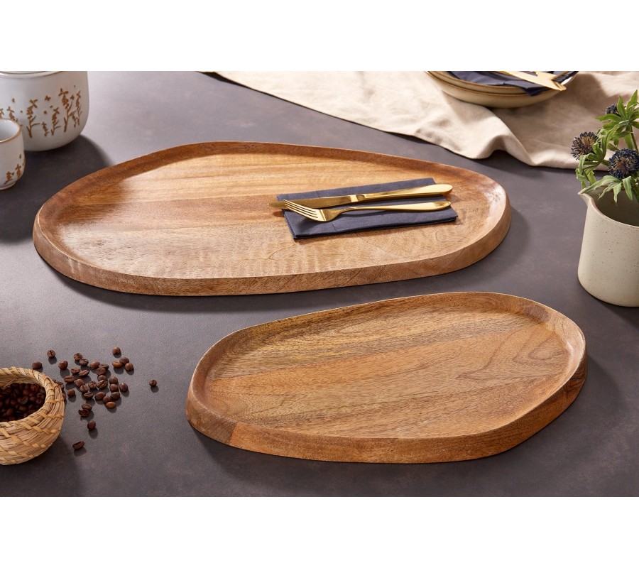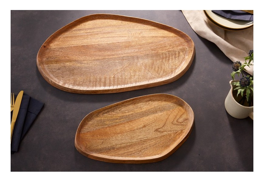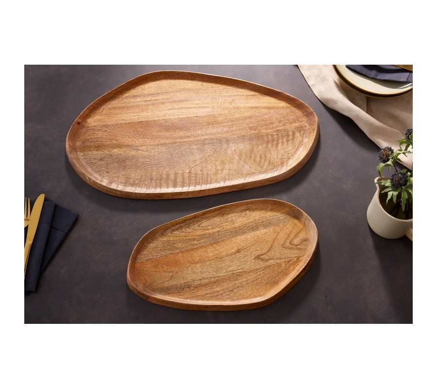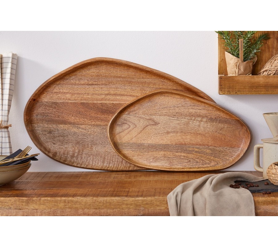 Set dvoch drevených podnosov Amanita II je praktickým i esteticky pôsobivým doplnkom vhodným na doplnenie do obývačiek či jedální. Podnosy Amanita sú vyrobené z masívneho mangového dreva a nesú sa v prírodnej hnedej farbe. Povrchová úprava necháva vyniknúť krásnu kresbu dreva, čím vzniká unikátny naturálny vzhľad. Ten je umocnený aj organickými nepravidelnými oválnymi tvarmi. Podnosy majú široké možnosti využitia, od miesta na servírovanie dezertov či iného občerstvenia cez uloženie príborov, nápojov či iných predmetov k stolovaniu. Podnosy sa dajú výborne využiť aj na vystavenie dekorácií. Svojím príjemným dizajnom dopomôžu k zútulneniu vašich priestorov a prakticky i štýlovo doladia každý moderný i vidiecky ladený interiér!