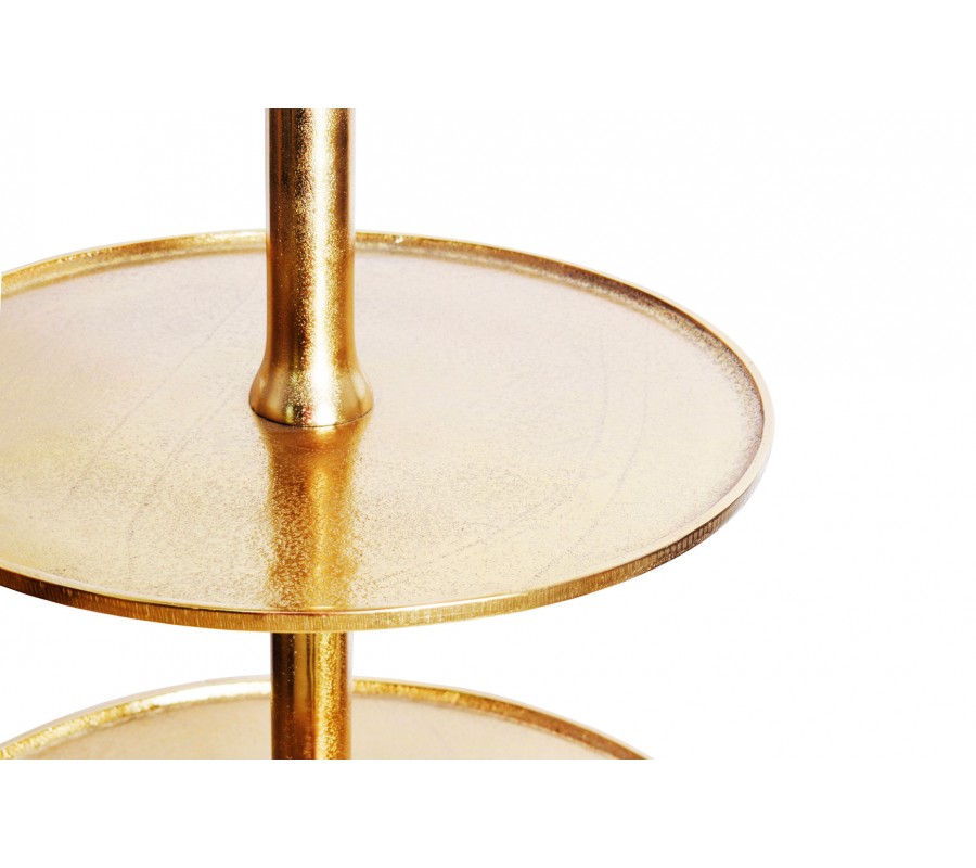 Luxusný etažér Amelié sa stane majestátnym stredobodom vášho stolovania. So svojou impozantnou výškou obsahuje až päť úrovní postupne sa zmenšujúcich tanierov s mierne vyvýšenými okrajmi. Zlatá farba z neho robí výnimočný doplnok, ktorý praktické využitie a zároveň je aj výrazným dekoratívnym doplnkom. Siluete dominujú oblé tvary, počnúc symetrickými kruhovými úrovňami, až po valcovitú stredovú os, ukončenú na vrchole guľatým prvkom. Podstava je taktiež kruhová a jej hrúbka zaručuje dobrú stabilitu etažéra. Ručná výroba zaručuje dôslednosť pri výrobe, pozornosť k detailom a originalitu každého produktu. Etažér oceníte pri oslavách či sviatočných posedeniach, no vďaka skvostnej zlatej farbe ho tiež môžete použiť ako dekoratívny prvok v kombinácii so sezónnymi dekoráciami či živými rastlinami - závisí len na vašej fantázii. Lesklé metalické prevedenie ho priam predurčuje do priestorov zariadených v honosnom art deco štýle. Ľahko ho prepojíte so stoličkami či stolom so zlatými nožičkami a vášmu jedálenskému priestoru tak dodáte pomyselnú korunu.