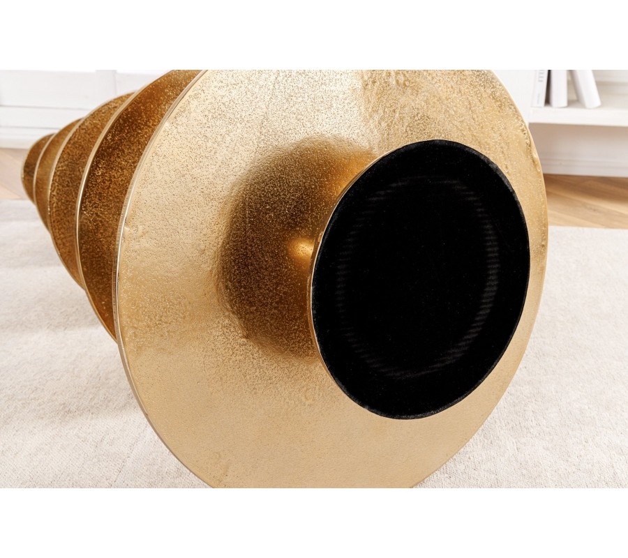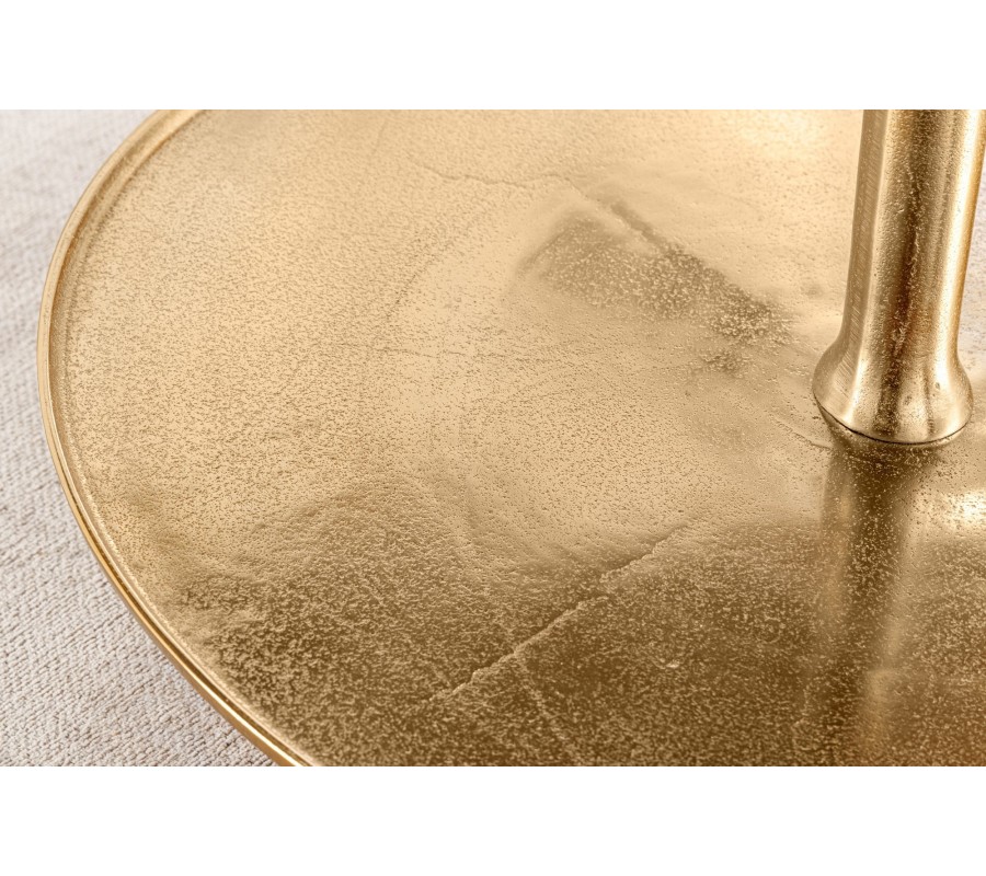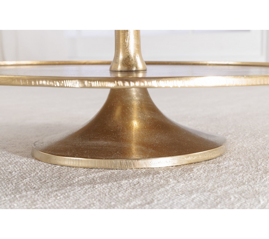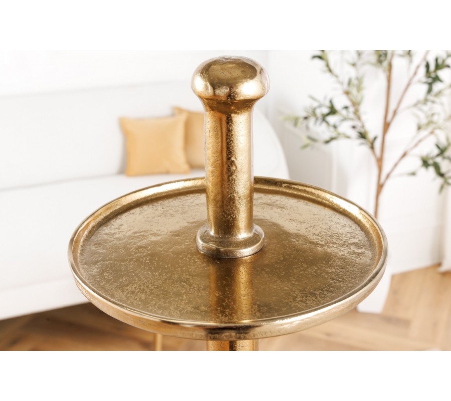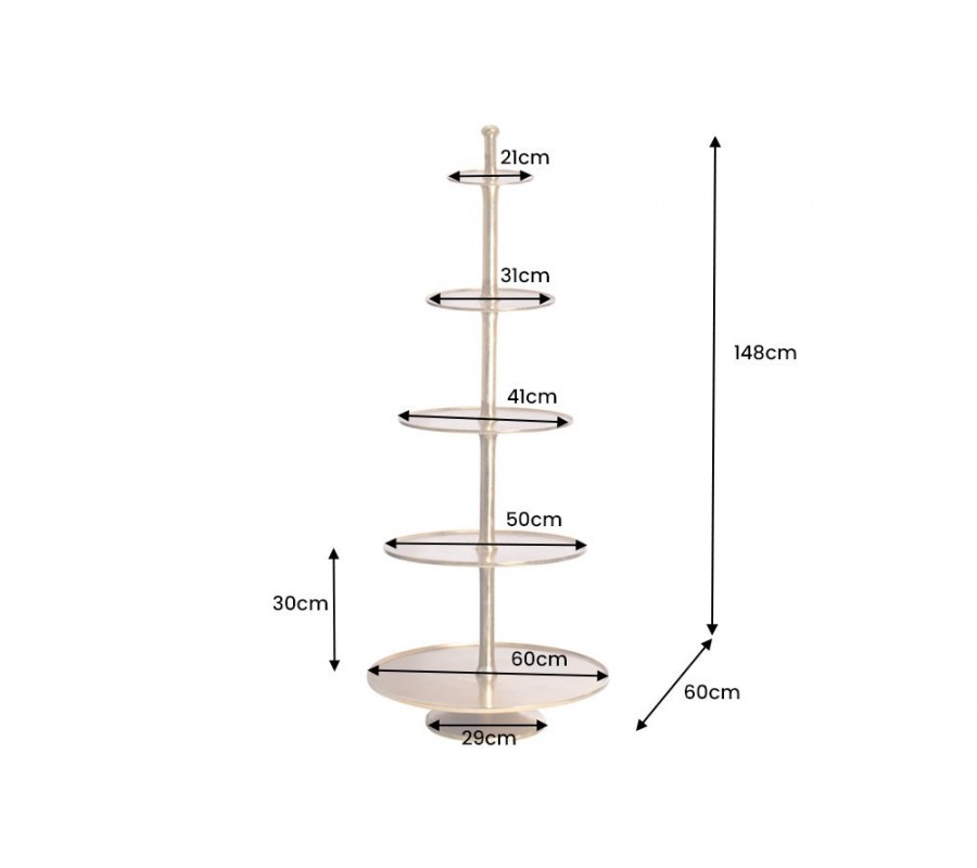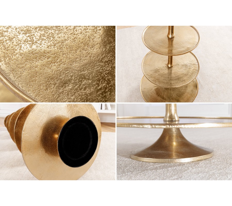 Luxusný etažér Amelié sa stane majestátnym stredobodom vášho stolovania. So svojou impozantnou výškou obsahuje až päť úrovní postupne sa zmenšujúcich tanierov s mierne vyvýšenými okrajmi. Zlatá farba z neho robí výnimočný doplnok, ktorý praktické využitie a zároveň je aj výrazným dekoratívnym doplnkom. Siluete dominujú oblé tvary, počnúc symetrickými kruhovými úrovňami, až po valcovitú stredovú os, ukončenú na vrchole guľatým prvkom. Podstava je taktiež kruhová a jej hrúbka zaručuje dobrú stabilitu etažéra. Ručná výroba zaručuje dôslednosť pri výrobe, pozornosť k detailom a originalitu každého produktu. Etažér oceníte pri oslavách či sviatočných posedeniach, no vďaka skvostnej zlatej farbe ho tiež môžete použiť ako dekoratívny prvok v kombinácii so sezónnymi dekoráciami či živými rastlinami - závisí len na vašej fantázii. Lesklé metalické prevedenie ho priam predurčuje do priestorov zariadených v honosnom art deco štýle. Ľahko ho prepojíte so stoličkami či stolom so zlatými nožičkami a vášmu jedálenskému priestoru tak dodáte pomyselnú korunu.