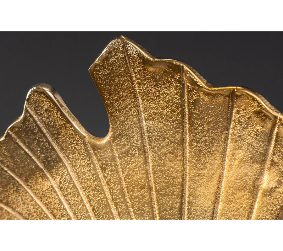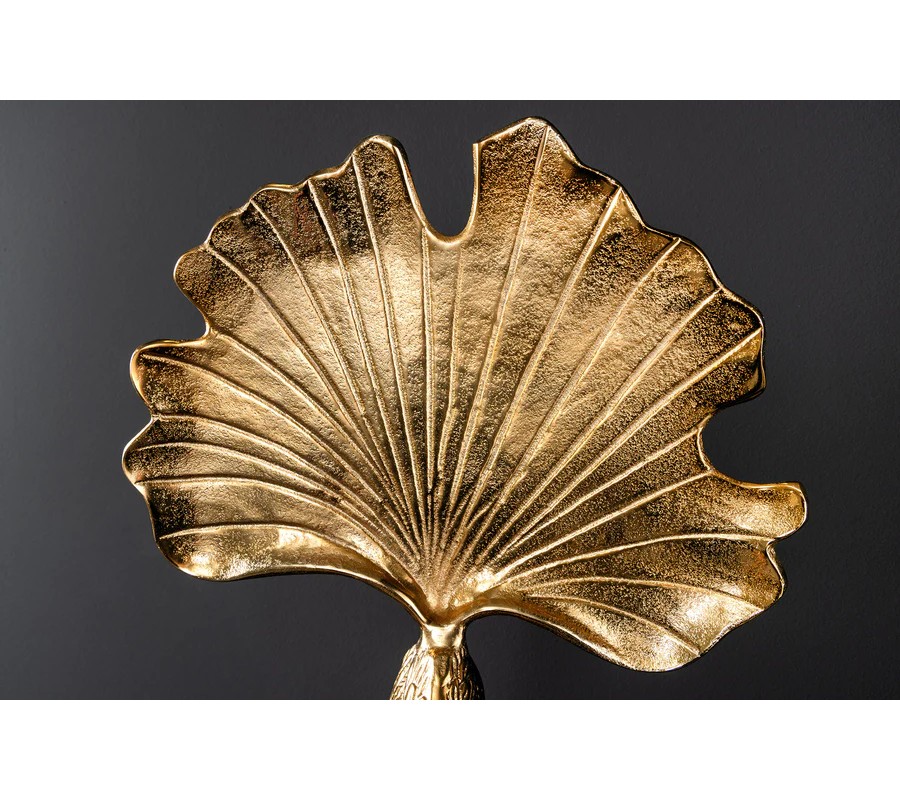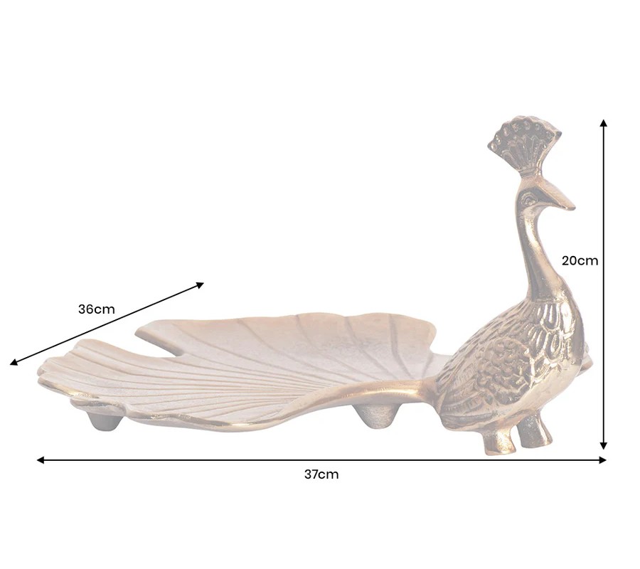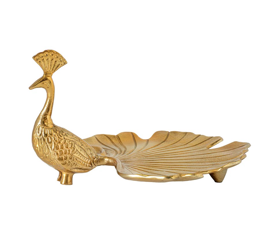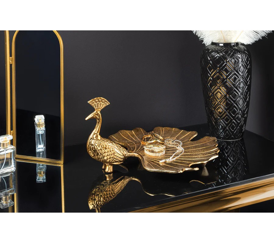 Ozdobná dekoratívna tácka Peak je umeleckým doplnkom v tvare majestátneho páva, ktorý okamžite pritiahne pozornosť. Tácka je vyrobená z kovu v zlatej farbe s lesklým povrchom, ktorý odráža svetlo a dodáva jej luxusný vzhľad. Chvost páva tvorí hlavnú plochu tácky, pričom jeho detaily a tvarovanie pripomínajú rozprestreté perie. Figurálna časť páva, s precízne vytvarovanou hlavou a zdobeným telom, pôsobí sofistikovane a elegantne. Každý kus je ručne vyrábaný, čo podčiarkuje jeho remeselnú hodnotu a jedinečnosť.
