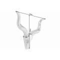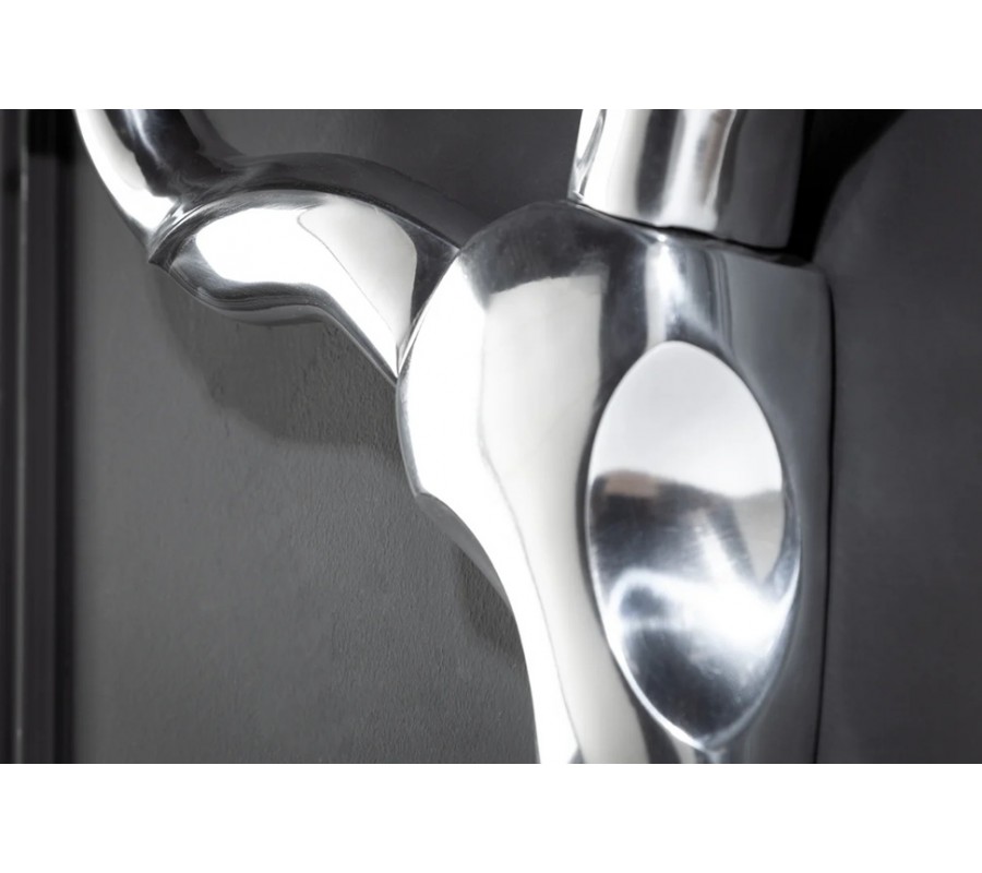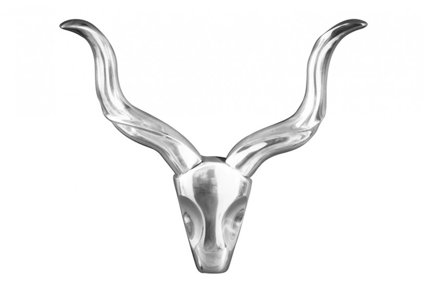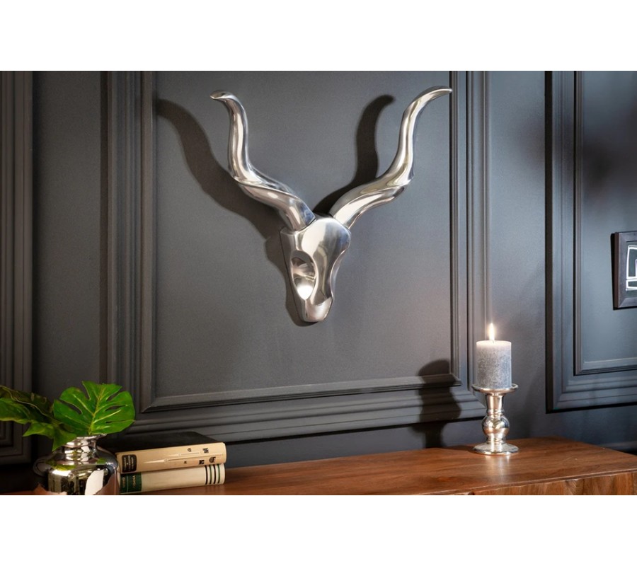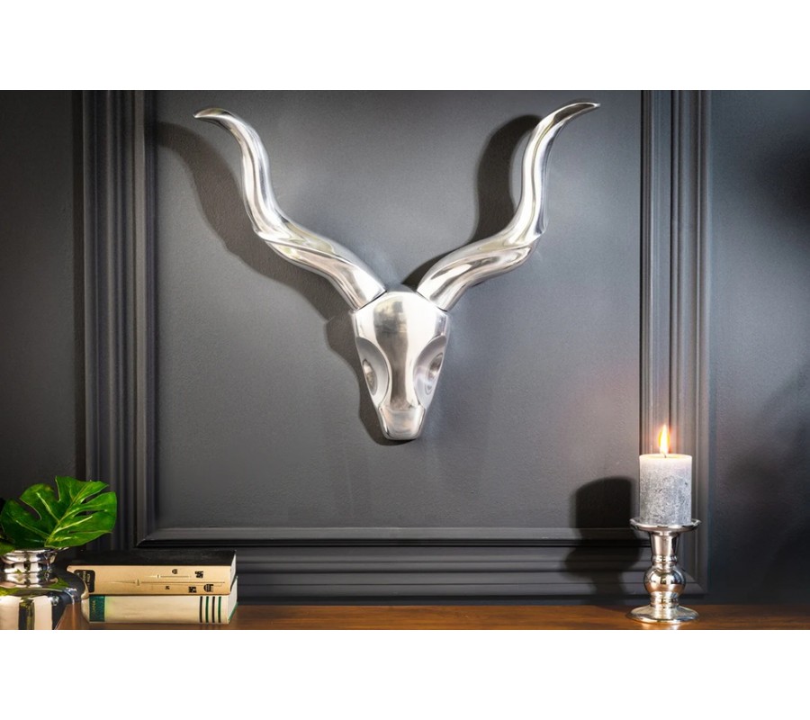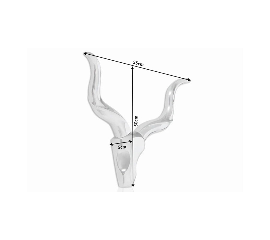 Dekorácia je vyrobená z kovovej zliatiny, vďaka čomu je odľahčená a ľahko sa tak zavesí na stenu. Spodná časť je tvarovaná do siluety lebky gazely so zvýraznenými nadočnicovými oblúkmi. Vo vrchnej časti sa k hlave napájajú dva impozantné zahnuté rohy s elegantným zatočením. Povrch dekorácie je hladký, s lesklým strieborným náterom, čo v kombinácii s jasne definovanými líniami pôsobí moderným dojmom. V zadnej časti je umiestnený závesný mechanizmus s otvorom na dva háčiky.
